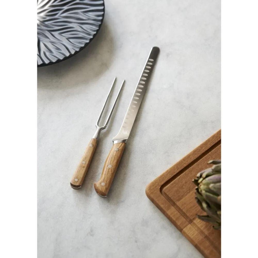 Knivbladet er udført i rustfrit kvalitetsstål og håndtaget i olieret eg, som ved brug vil udvikle patina og blot blive smukkere, jo mere kniven bruges. Træhåndtaget er udformet af ét stykke træ og er behageligt at holde om. Bladet er designet med luftskær, der sørger for, at fisken ikke sætter sig fast på bladet.
