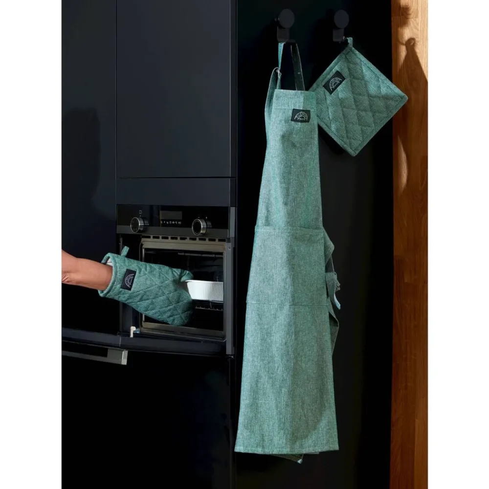 Køkkentekstiler i gode design i både klassiske og moderigtige farver. Tekstilerne vaskes ved 40 grader. Overskudsfarve kan forekomme, især ved mørke farver, derfor anbefales separat vask. Brug vaskemiddel uden optisk hvidt og blegemiddel. Krympning 5-10 %. Tekstilet kan “trækkes” glat eller stryges.