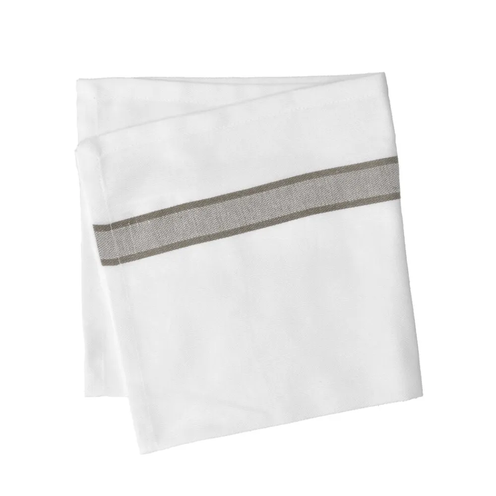 Stofserviet fremstillet i 100 % bomuld. Det klassiske hvide stof kombineret med en enkel farvet stribe giver mulighed for et let og personligt udtryk. Servietten er blød, behagelig og nem at folde, så du kan variere udtrykket, når borddækningen skal have lidt ekstra opmærksomhed.