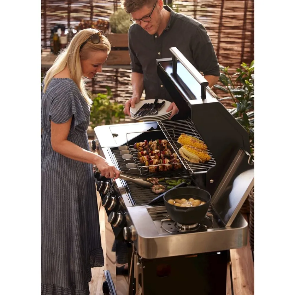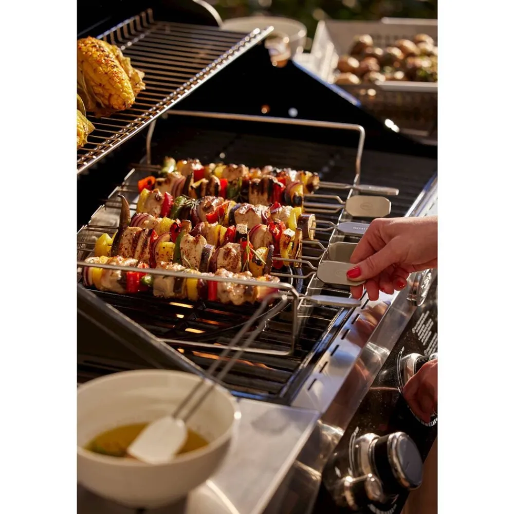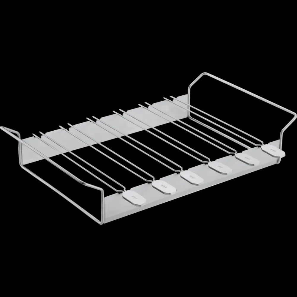 Sæt med 6 spyd og et stativ. Spyddene kan drejes og holdes i 4 positioner for at sikre all-round grillning. Dobbeltspidser forhindrer maden i at glide, når den drejes. Ideel til at holde mindre madvarer. Længde på hvert spyd er ca. 33 cm. Velegnet til kedelgrill 60 cm. Kan også bruges på gasgrill, så længe dybden på kogekammeret er 30 cm.