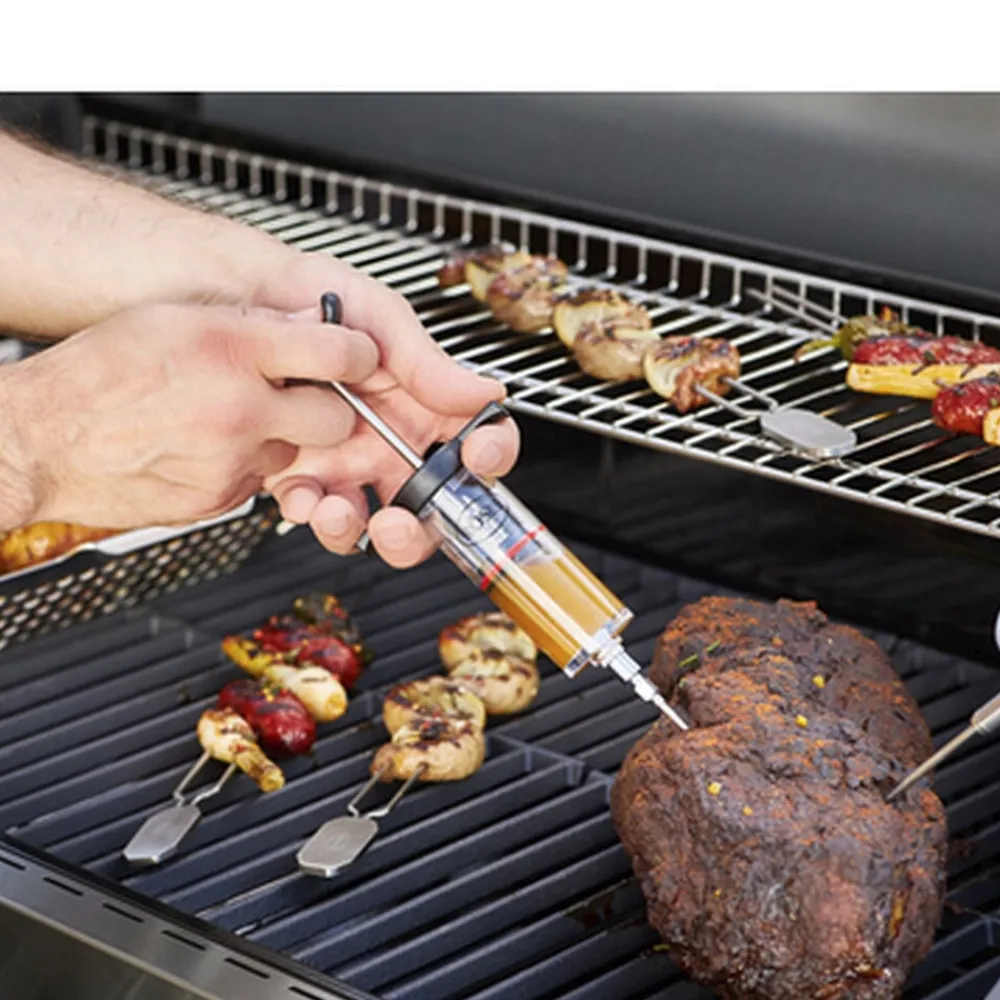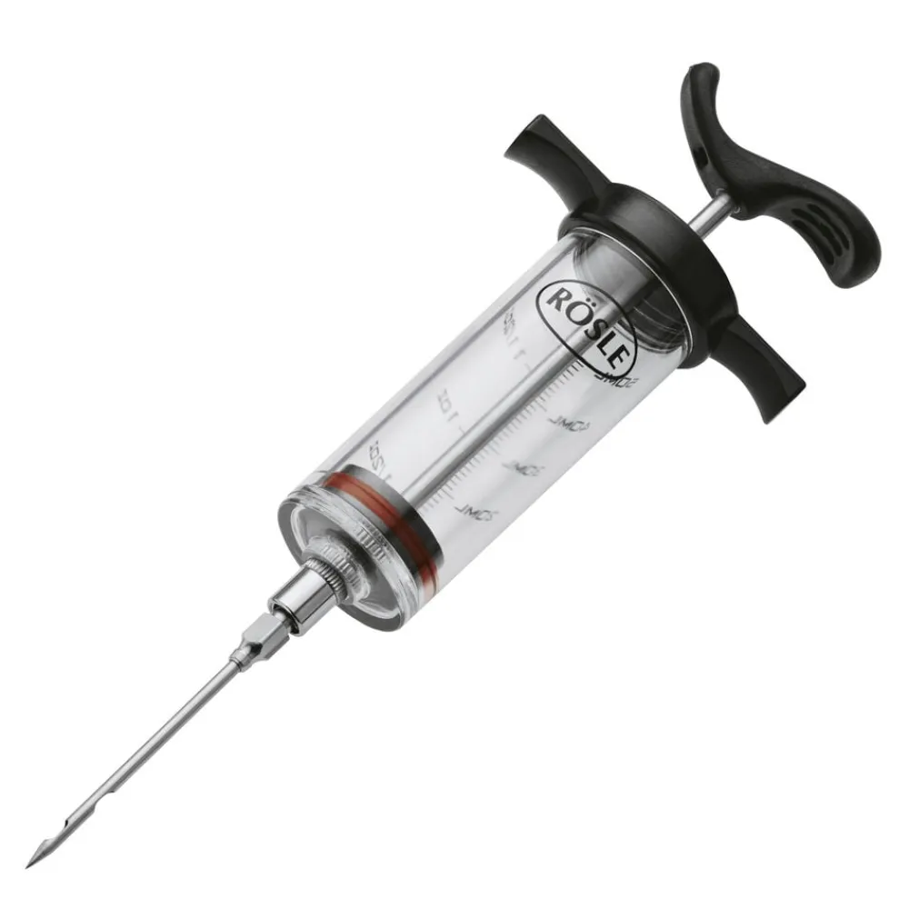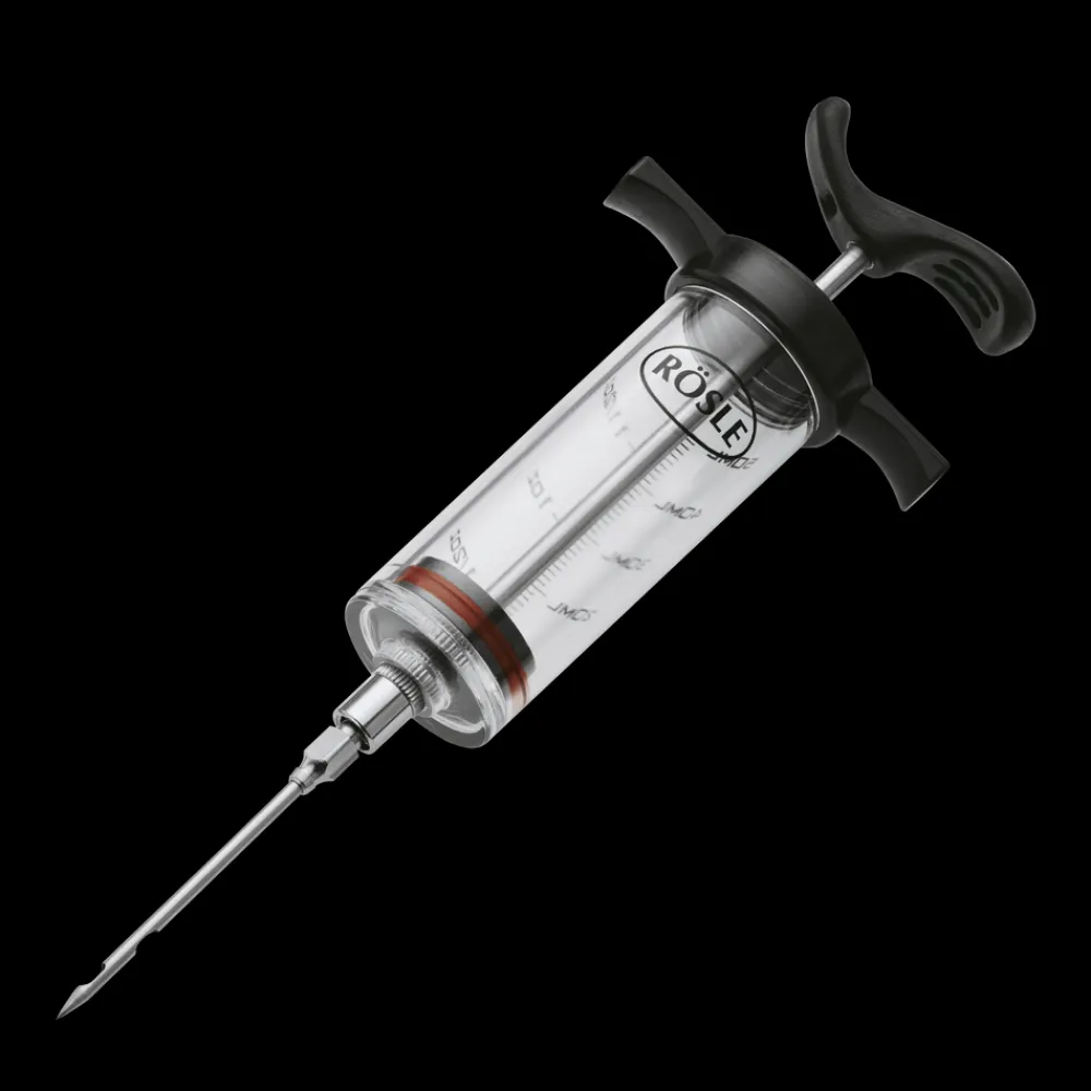 Marinade kan injiceres direkte i kødet med marinadesprøjten: Intensiverer aromaen og forkorter marineringstiden. Kapacitet: 50 ml. Aftagelig nål med hurtiglåsemekanisme.