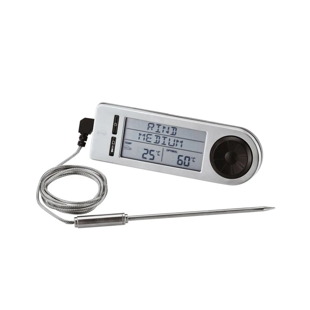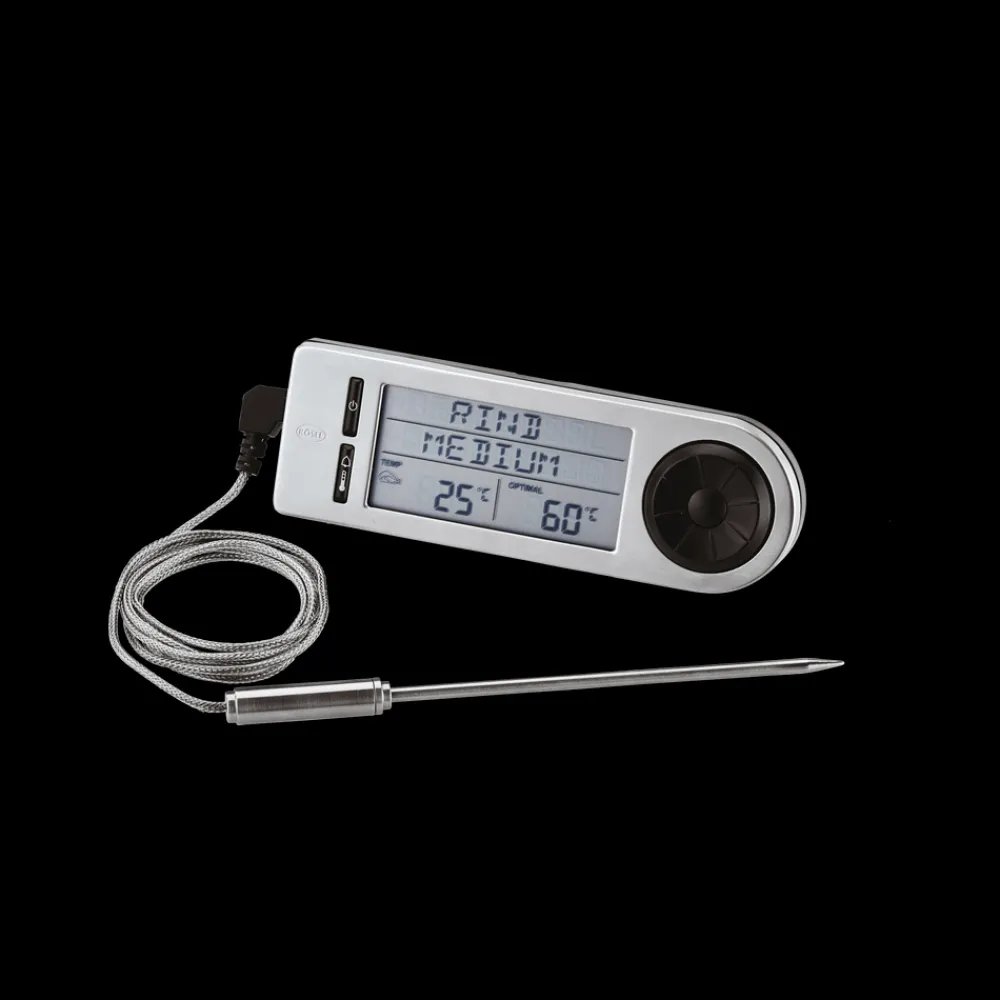 Stegetermometer med digitalt display til at bestemme den ideelle temperatur i fem forskellige slags kød. En anden sensor måler grill- eller ovntemperaturen. Måler fra -20 °C to +250 °C. Vælg mellem følgende sprog: tysk, engelsk eller fransk. Ledning: 1 m. Tåler ikke opvaskemaskine. Bruger 2 x CR2032 knapcellebatterier (medfølger ikke).