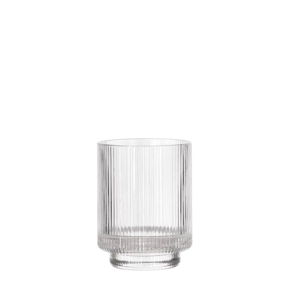 Clarity sæbedispenseren og tandbørsteholderen er lavet af riflet glas med et diskret bølgemønster. Den slanke silhuet giver et cool og elegant look.