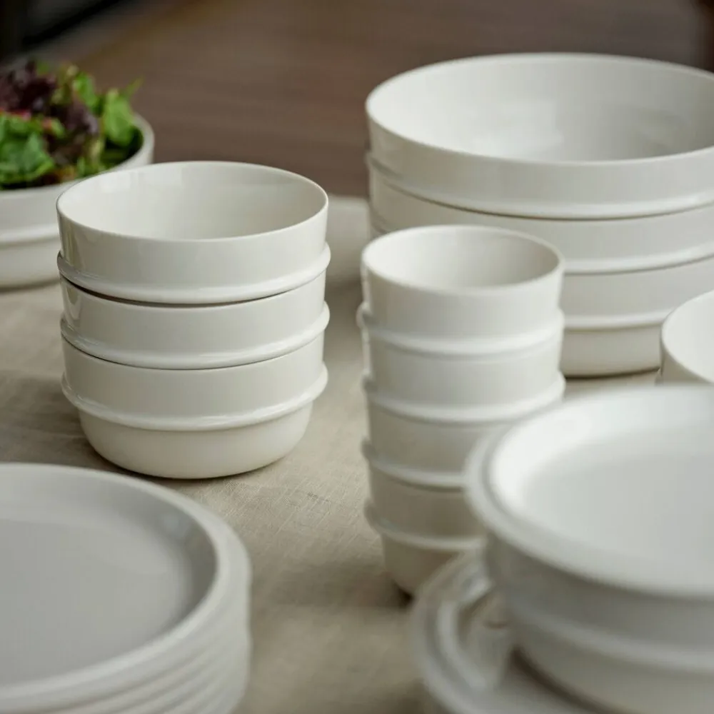 Serviceserien Eau er et godt bud på en moderne klassiker. Udtrykket enkelt og imødekommende, og alt overflødigt er skåret væk. Du kan stable kopper, skåle og tallerkener sikkert, hvilket selvsagt letter borddækning og afrydning, men også optimerer pladsen i skabet. Desuden kan tallerkenerne fungere som låg til skålene. Samtidig betyder det, at du kan lave uhøjtidelige og charmerende buffet-opstillinger som i Sydeuropa, hvor tallerkenerne stakkes til høflig og hyggelig selvbetjening. Uanset om du inviterer på tapas i hjemmet, kagebuffet i haven eller spontan nabomiddag på villavejen. EAU-serien består af tallerkener og skåle i forskellige størrelser samt kop og karaffel. Porcelænet i serien er udført i den klassiske og lækre nuance offwhite.