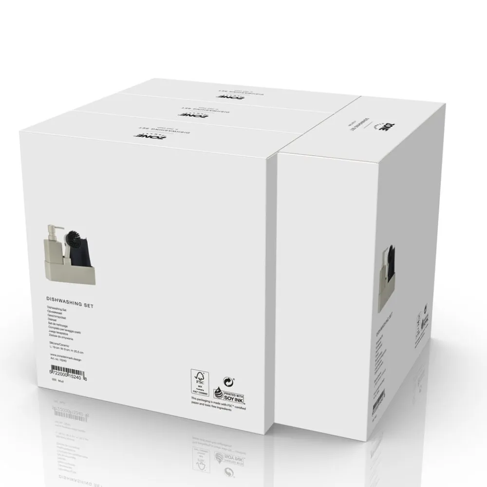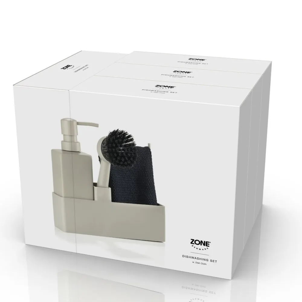 Zones populære alt-i-ét opvaskesæt med karklud. Sæbedispenseren er fremstillet i solid keramik, og opbevaringsdelen er i ridsefri og rengøringsvenlig silikone. Børsten kan stå selv, og børstehovedet kan udskiftes, så du altid har en frisk børste.