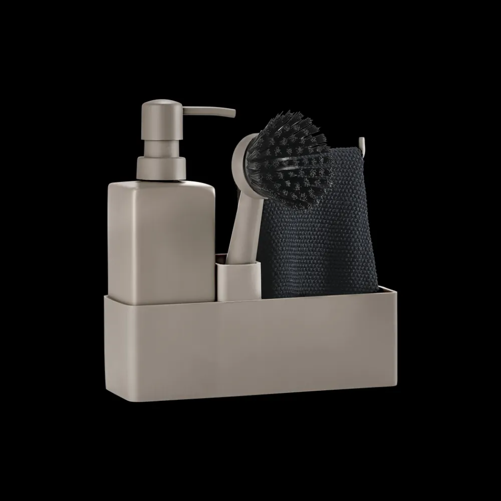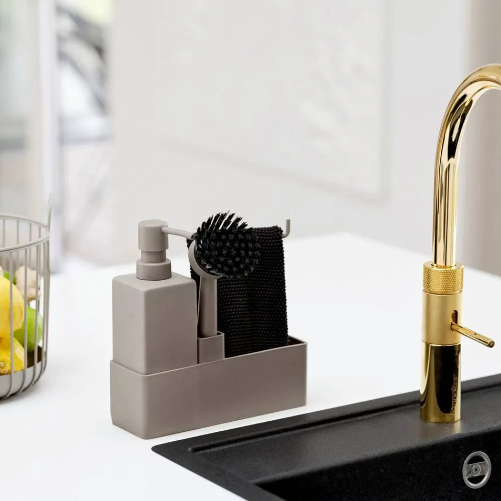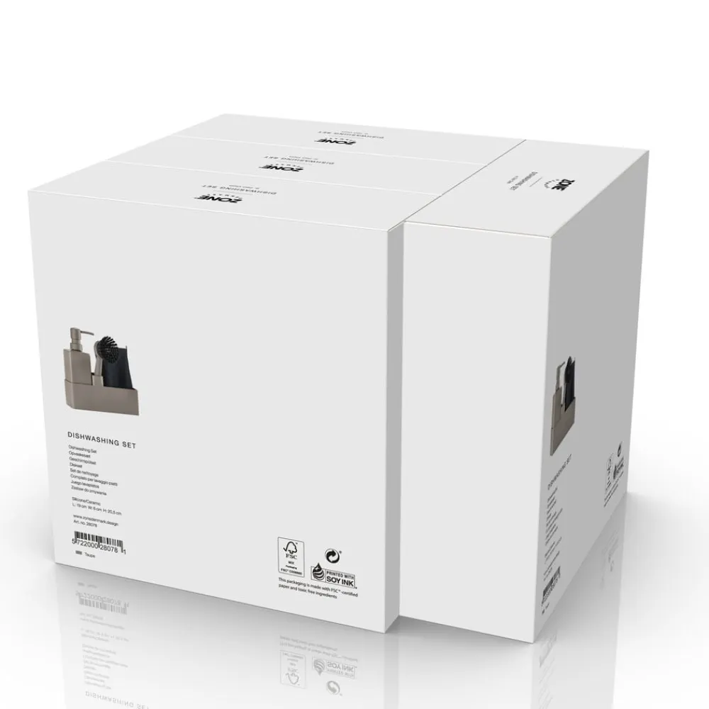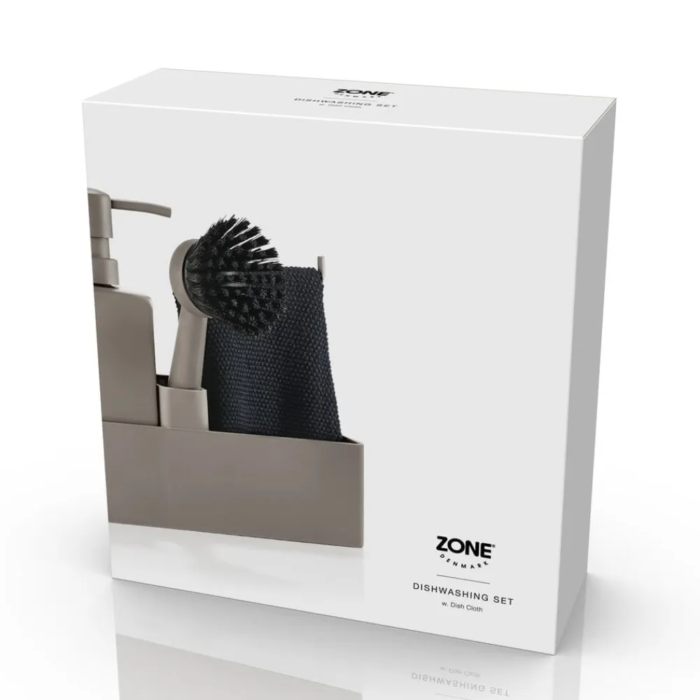 Zones populære alt-i-ét opvaskesæt med karklud. Sæbedispenseren er fremstillet i solid keramik, og opbevaringsdelen er i ridsefri og rengøringsvenlig silikone. Børsten kan stå selv, og børstehovedet kan udskiftes, så du altid har en frisk børste.