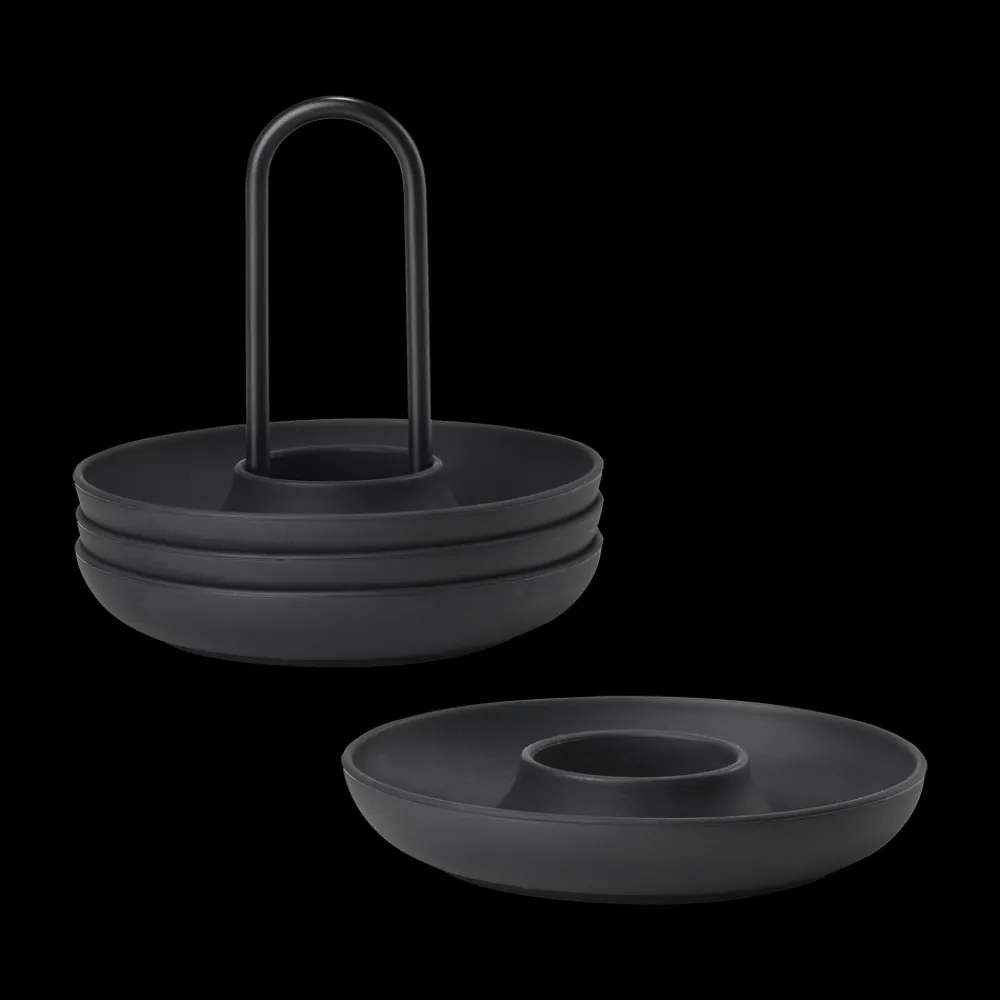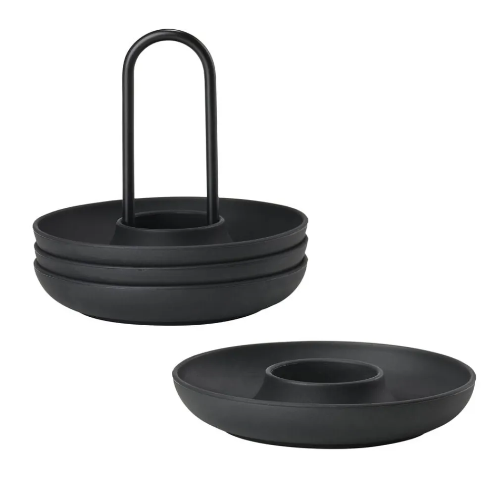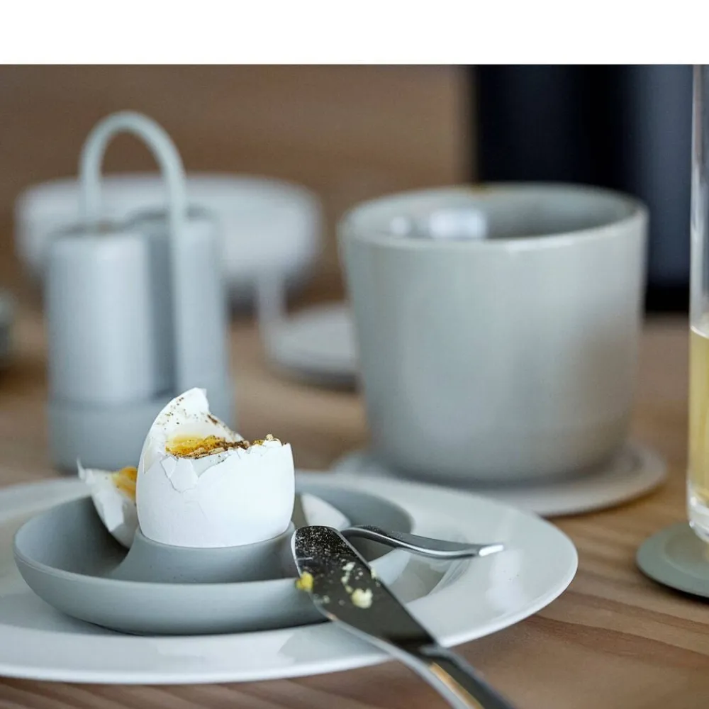 De fire æggebægre i holder fra Singles kan sættes på bordet med kun én hånd. Og den buede kant fanger både salt, æggeskaller og gæsternes opmærksomhed. Så kan du spise brunch med stil – fx i selskab med gode venner.