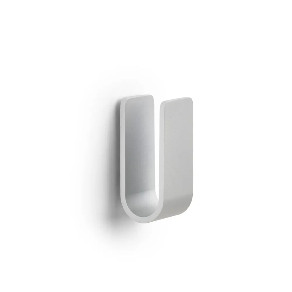 De små vægkroge kan sikkert, men diskret, bære alt fra håndklæderne til badebørsten. De runde hjørner giver krogene et venligt udtryk, og takket være skjulte beslag har de en klædelig lethed på væggen. De er lette at montere, ja faktisk er det sværeste nok at vælge farve. De små skønheder i pulverlakeret aluminium fås nemlig i hele 9 forskellige nuancer samt rustfrit mat stål.