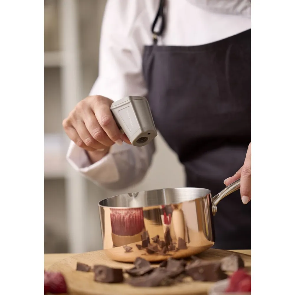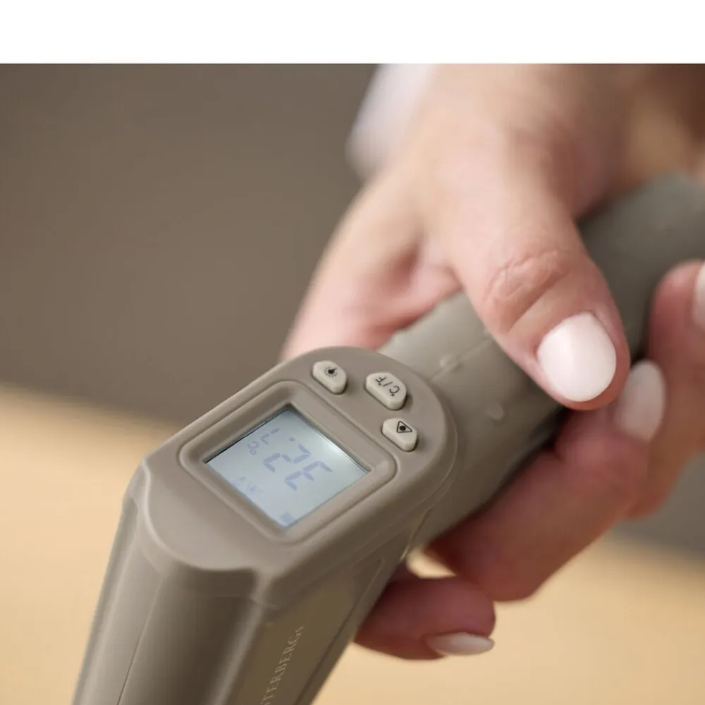 Når temperaturen skal sidde lige i skabet. Det infrarøde termometer måler hurtigt og præcist fra -50 °C til 550 °C og er helt oplagt, når du skal have styr på overfladetemperaturen – fx under temperering af chokolade. Displayet lyser op, så det altid er nemt at aflæse temperaturen. Bruger 2 x AAA-batterier (medfølger ikke).