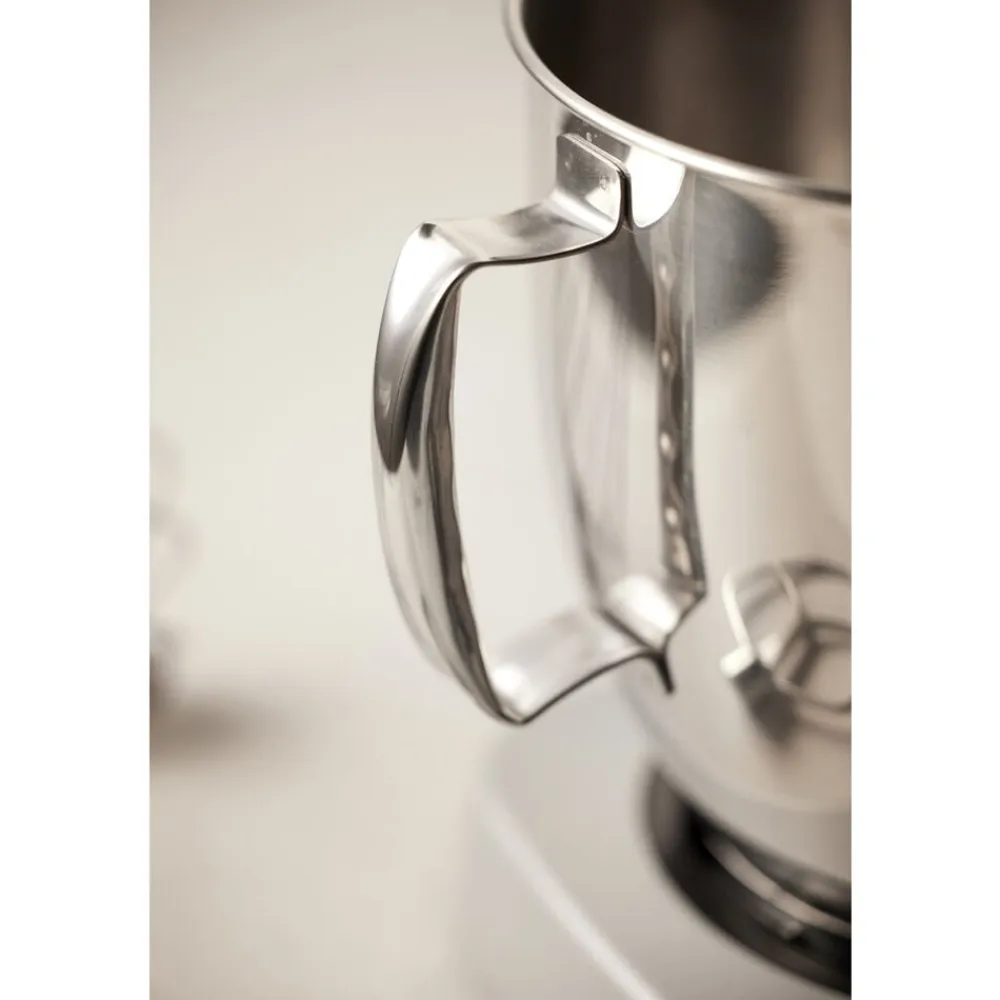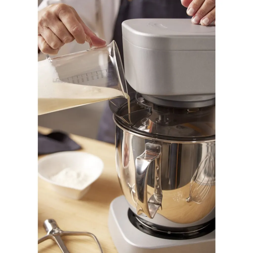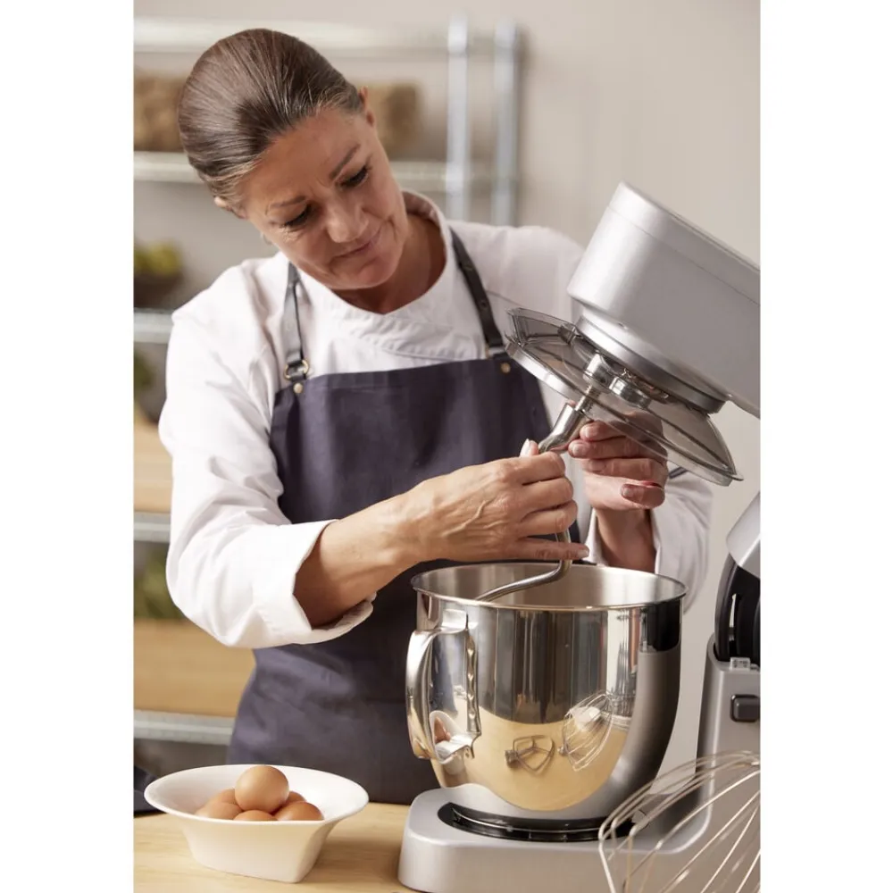 Røremaskinen står stabilt og sikkert på køkkenbordet og er særdeles støjsvag med et lydniveau, der spænder fra blot 39 dB ved laveste hastighed til kun 68 dB ved maks. hastighed, så du kan piske, ælte og røre uden at larme for meget i hjemmet. Det praktiske stænklåg forhindrer spild på bordet, og igennem lågets åbning kan ingredienser nemt tilføjes undervejs. Leveres med piskeris, dejkrog og K-spade. Tilbehørsdele tåler opvaskemaskine.