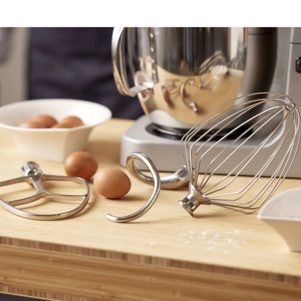 Tilbehørsdele: Et piskeris som pisker æggehvider, kagecreme eller en luftig flødeskum. Dejkrogen gør det nemt at ælte dej, uanset om det er til sunde boller, pizzadej eller anden smidig dej. K-spaden gør det nemt at røre kagedej eller frikadellefars.