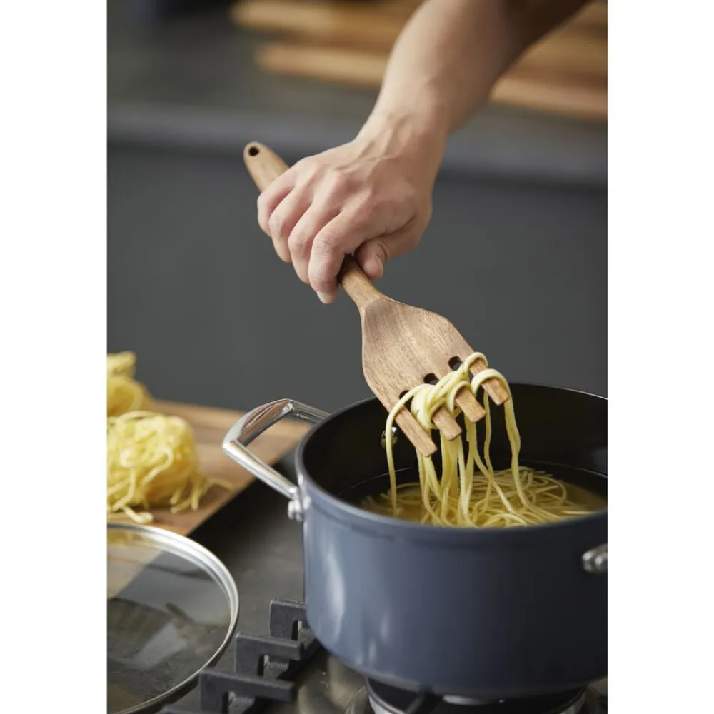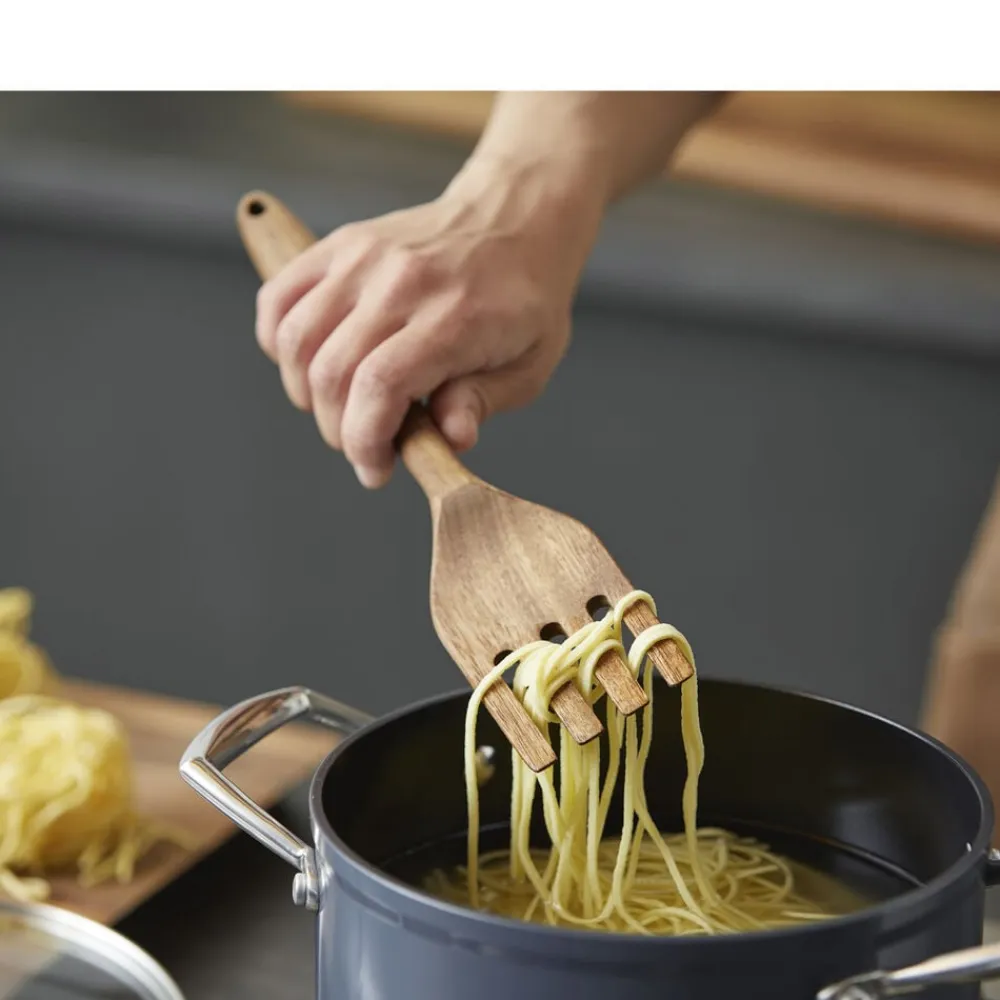 Gaffel 30,5 x 6 x 1,9 cm i akacietræ. Køkkenredskaber i træ er en smuk tilføjelse til køkkenet. Vaskes med varmt vand og mild sæbe. Tåler ikke opvaskemaskine. Træredskaber kan med fordel efterbehandles med olie et par gange om året for at bevare den flotte overflade.