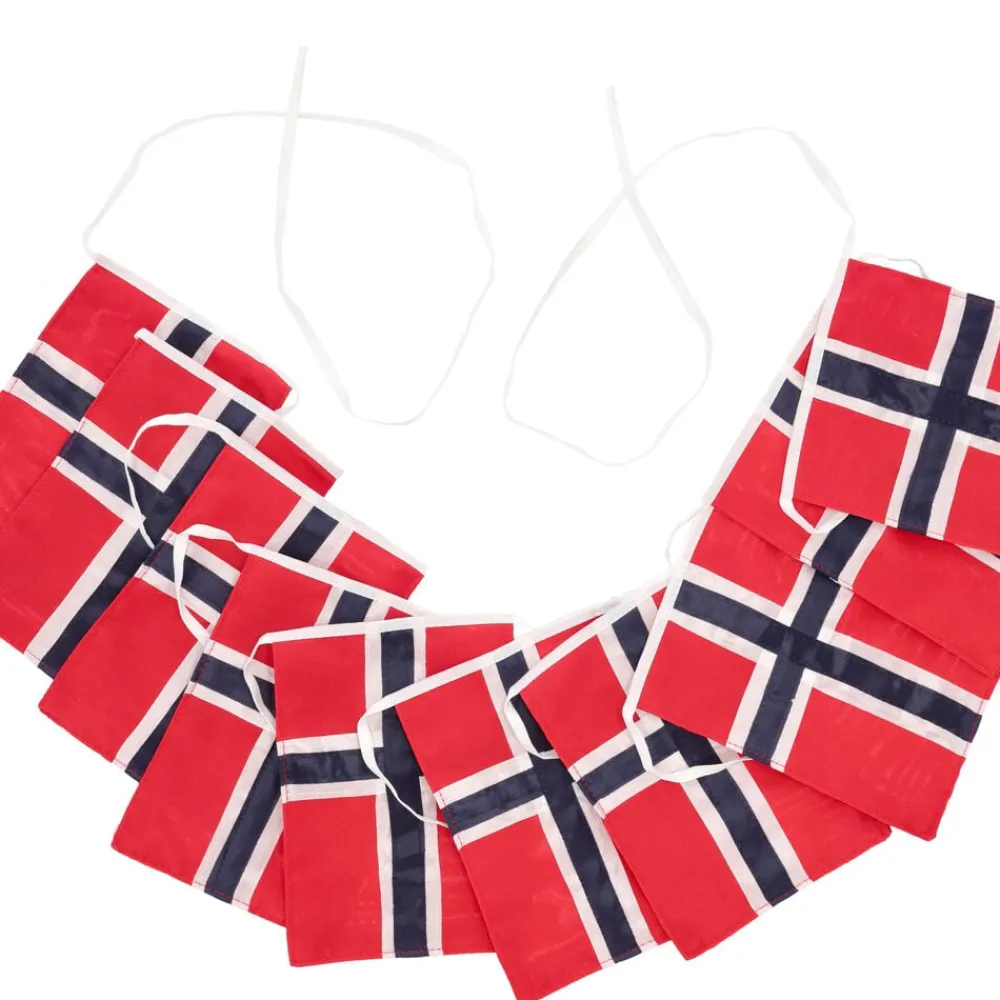 Pynt op med masser af flag, så alle kan se, at der er noget at fejre. Den 5,4 m lange flagranke har 10 norske flag i polyester, der hver måler 15 x 20 cm. Mellem hvert flag er der en afstand på 30 cm, og snoren i hver ende har en længde på 60 cm.