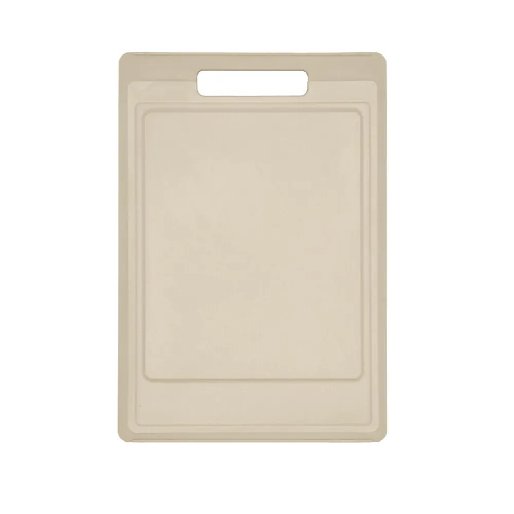 Funktionelt skærebræt i beige plast. Brættet har en bred saftrille på den ene side og er glat på den anden side, og begge sider af brættet kan derfor anvendes til forskellige skæreopgaver.