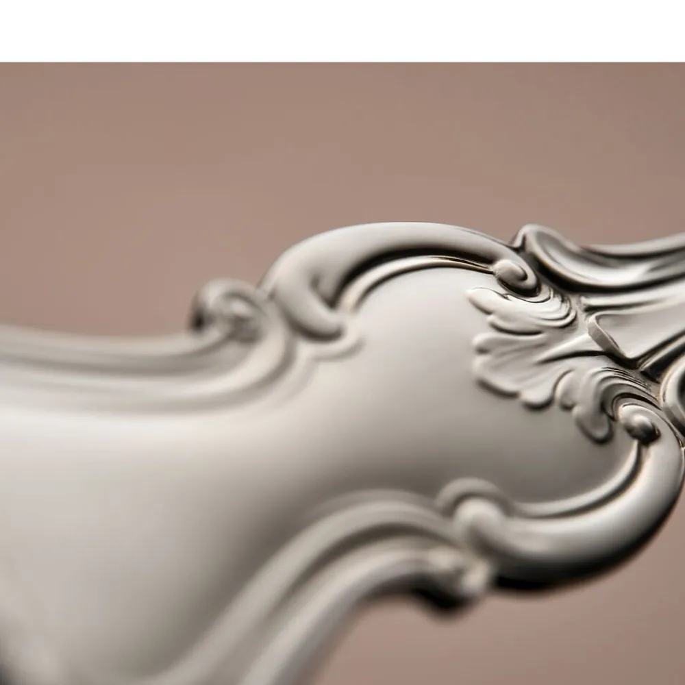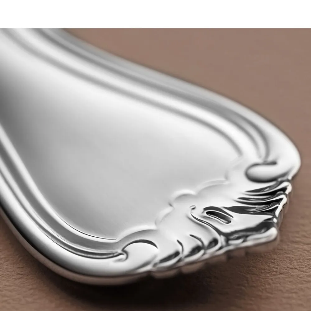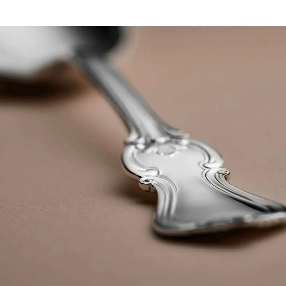 Olga har sin oprindelse i den engelske nyrokoko fra det 19. århundrede. Bestikket er designet til at passe til den tids storstilede borddækninger med krystalglas og smukt foldede servietter. Og det gør sig mindst lige så godt i dag – uanset stil og øvrige omgivelser. Med sine levende bladmønstre er det et design, der tager form og bliver noget, man snakker om rundt om bordet.