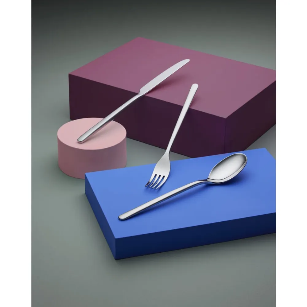 Med sin enkelhed og lange linjer understreger de bløde skulpturelle kurver og de roligt udformede detaljer den moderne og nordiske sans. Et underspillet, rent design skaber et elegant bestik, der nærmest svæver over bordet.