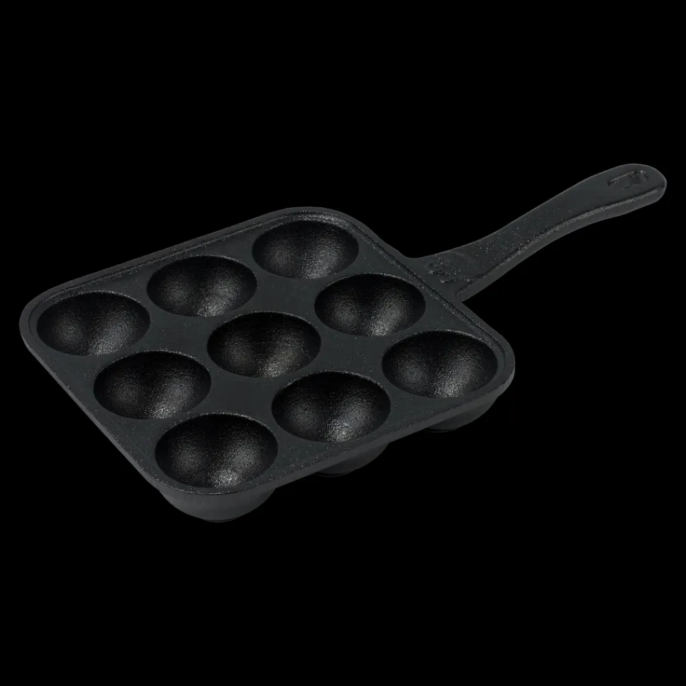 Æbleskivepande m. 9 huller i støbejern. Også god til frække torskedeller, frikadeller, muffins, lasagne on kop & falafel – kun fantasien sætter grænser.