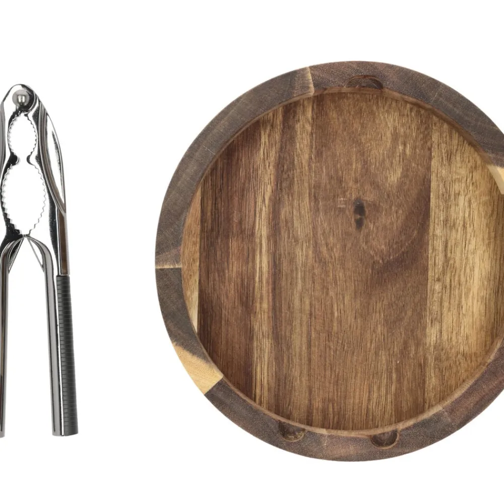 Nøddeknækkersæt med rund skål af akacietræ, dia. 17 cm, og nøddeknækker i metal med sort greb. Nøddeknækkerens hoved og håndtag passer ned i de små fordybninger på skålens kant, så den altid kan ligge klar til at knække nødder. Læg aldrig akacietræ i blød. Vaskes med varmt vand og mild sæbe. Tåler ikke opvaskemaskine. Kan med fordel efterbehandles med madolie et par gange om året.
