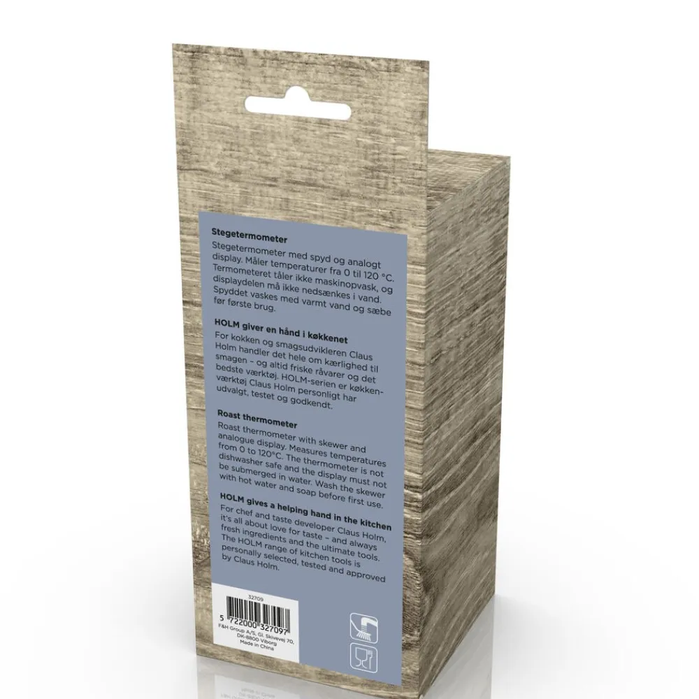 Termometeret tåler ikke maskinopvask, og displaydelen må ikke nedsænkes i vand. Spyddet vaskes med varmt vand og sæbe før første brug.