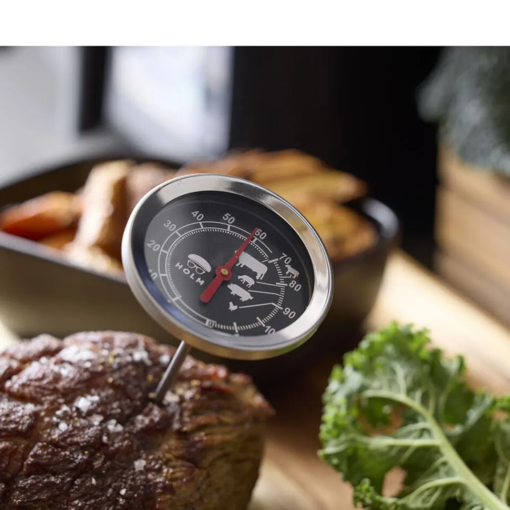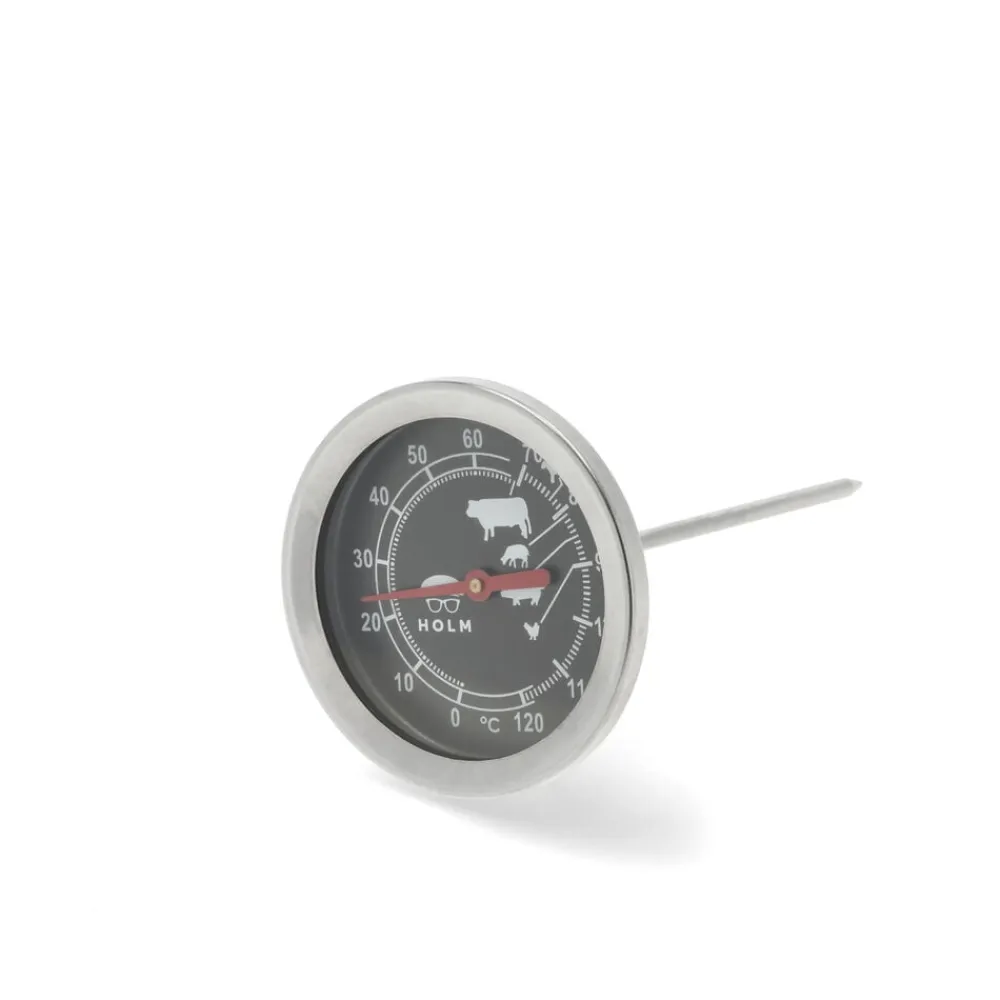 Stegetermometer med spyd og analogt display. Måler temperaturer fra 0 til 120 °C.