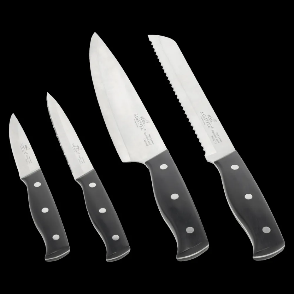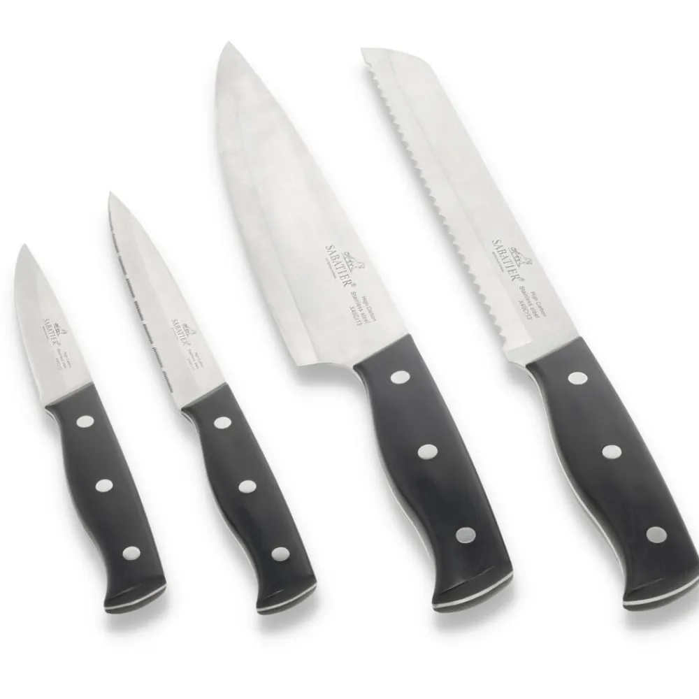 Lion Sabatier Austral er knive af rustfrit stål med skafter af sort ABS-plast. Urtekniv 9 cm, tomatkniv 13 cm, brødkniv 20 cm, kokkekniv 20 cm.