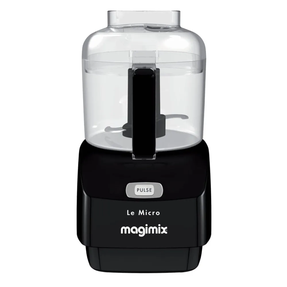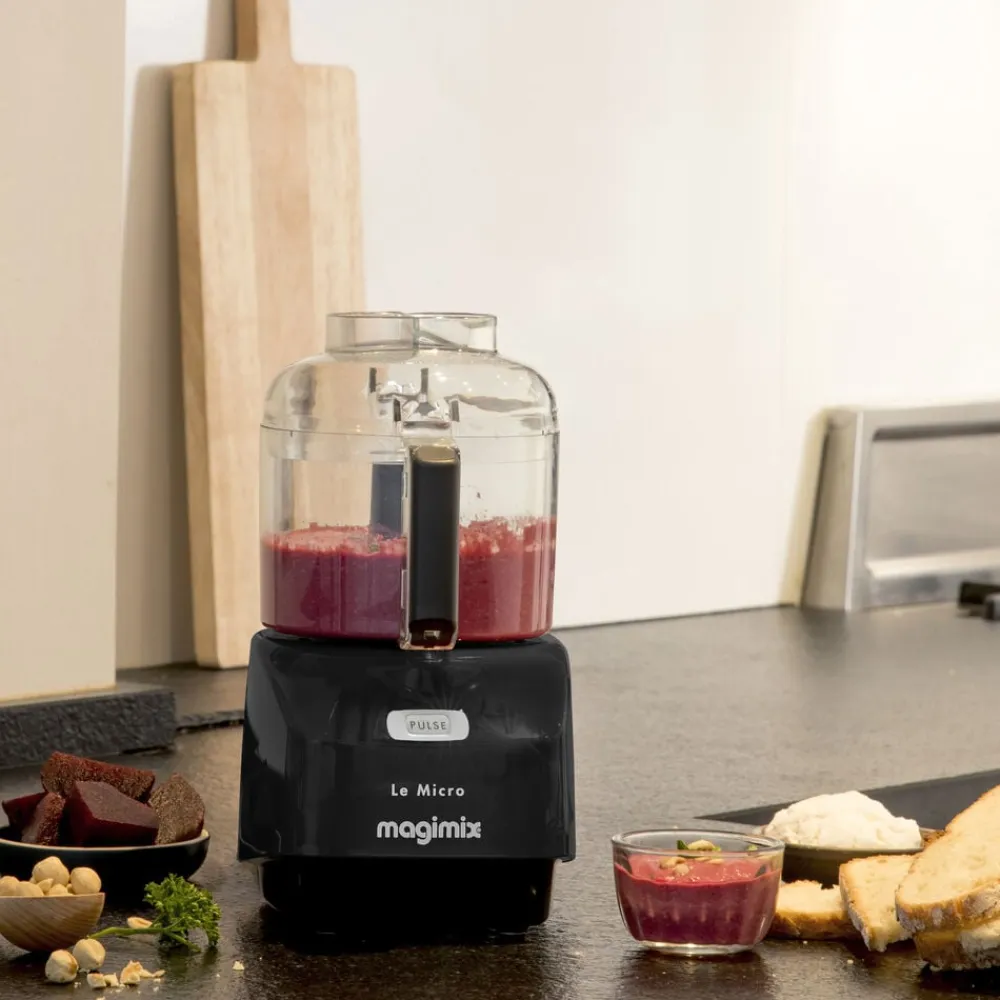 Magimix minihakker er effektiv, stilfuld og støjsvag. Den optager kun lidt plads på køkkenbordet og har et så flot design, at du gerne lader den stå fremme. Betjeningen er enkel. Låget har to åbninger til påfyldning af henholdsvis flydende og faste ingredienser, sættes let på og tages lige så nemt af. På fronten findes en enkelt knap til at aktivere både pulse-funktion og kontinuerlig kørsel, når knappen holdes nede.