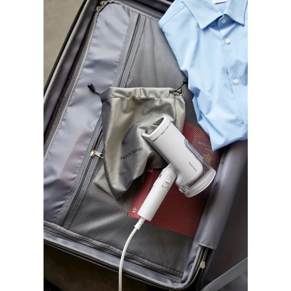 Håndsteameren har et kompakt design og kan nemt foldes sammen, så den ikke fylder ret meget, når du fx skal have den med ud at rejse. Der medfølger en varmeresistent opbevaringspose.