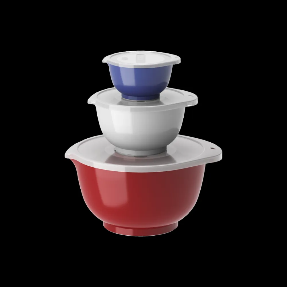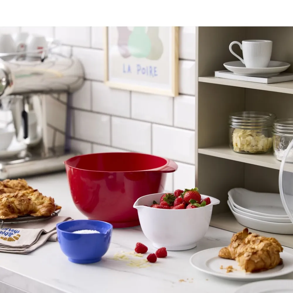Margrethe røreskålesæt fra Rosti i 3 af de mest anvendte størrelser. Sættet indeholder 0,25 blå + 0,75 hvid + 3 liter rød Margrethe-skåle med tilhørende låg.