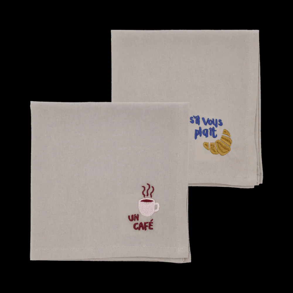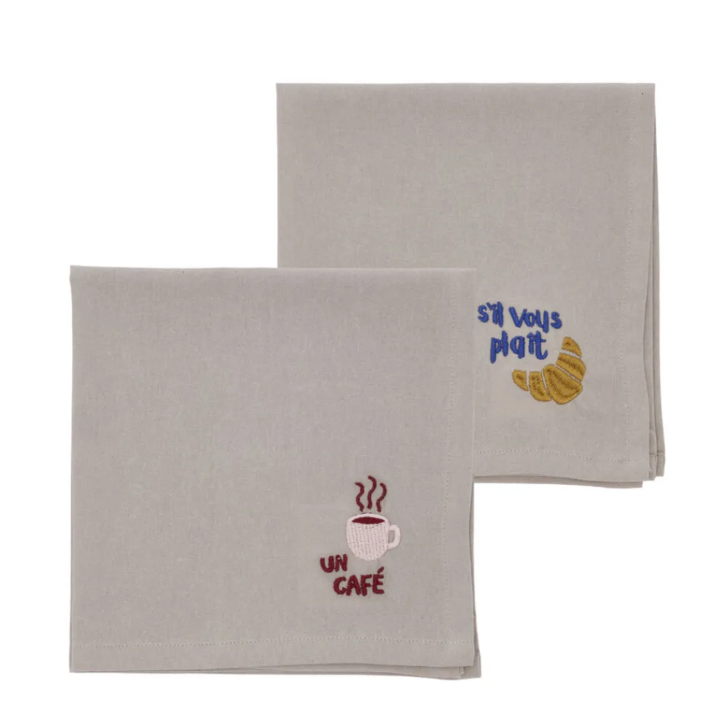Dækkeservietterne har skønne broderier inspireret af klassiske café-motiver: kirsebær, citroner, kaffekopper og croissanter. Broderierne er farverige, og den neutrale farve i dækkeservietten skaber den perfekte baggrund, der lader de fine design træde frem.
