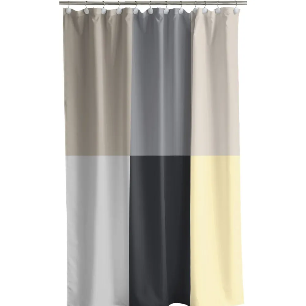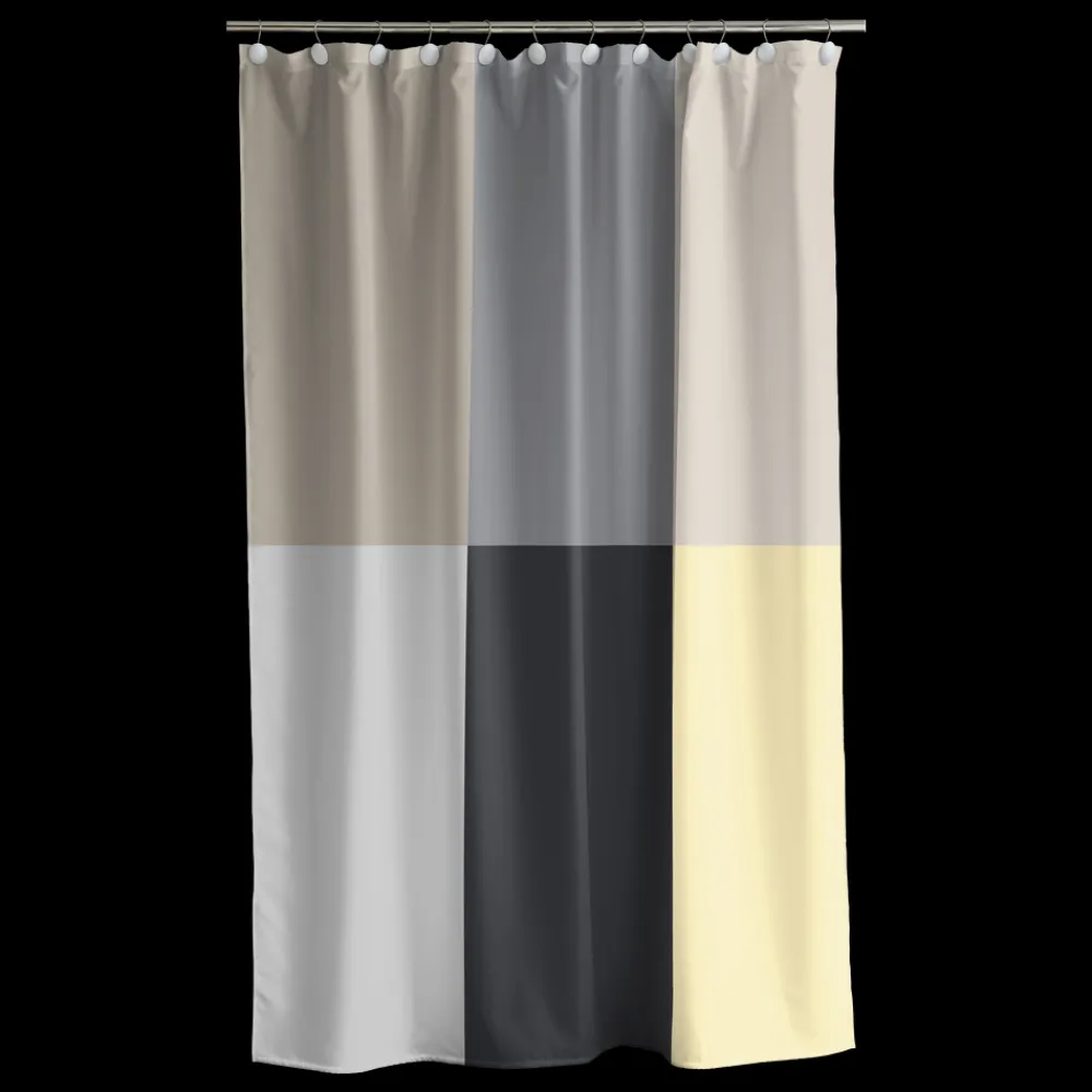 Fusion er et moderne og grafisk badeforhæng i colour block-design. Det er fremstillet i 50 % genanvendt polyester og 50 % konventionel polyester.