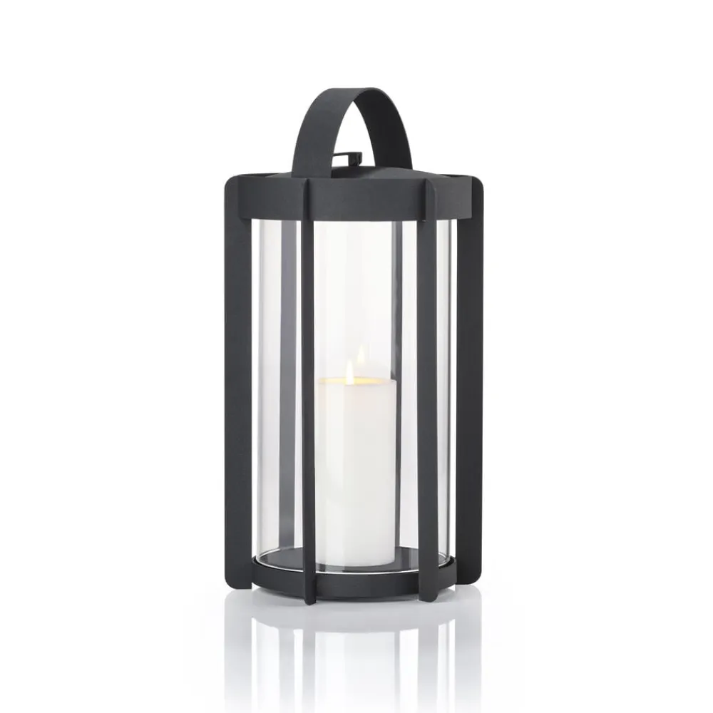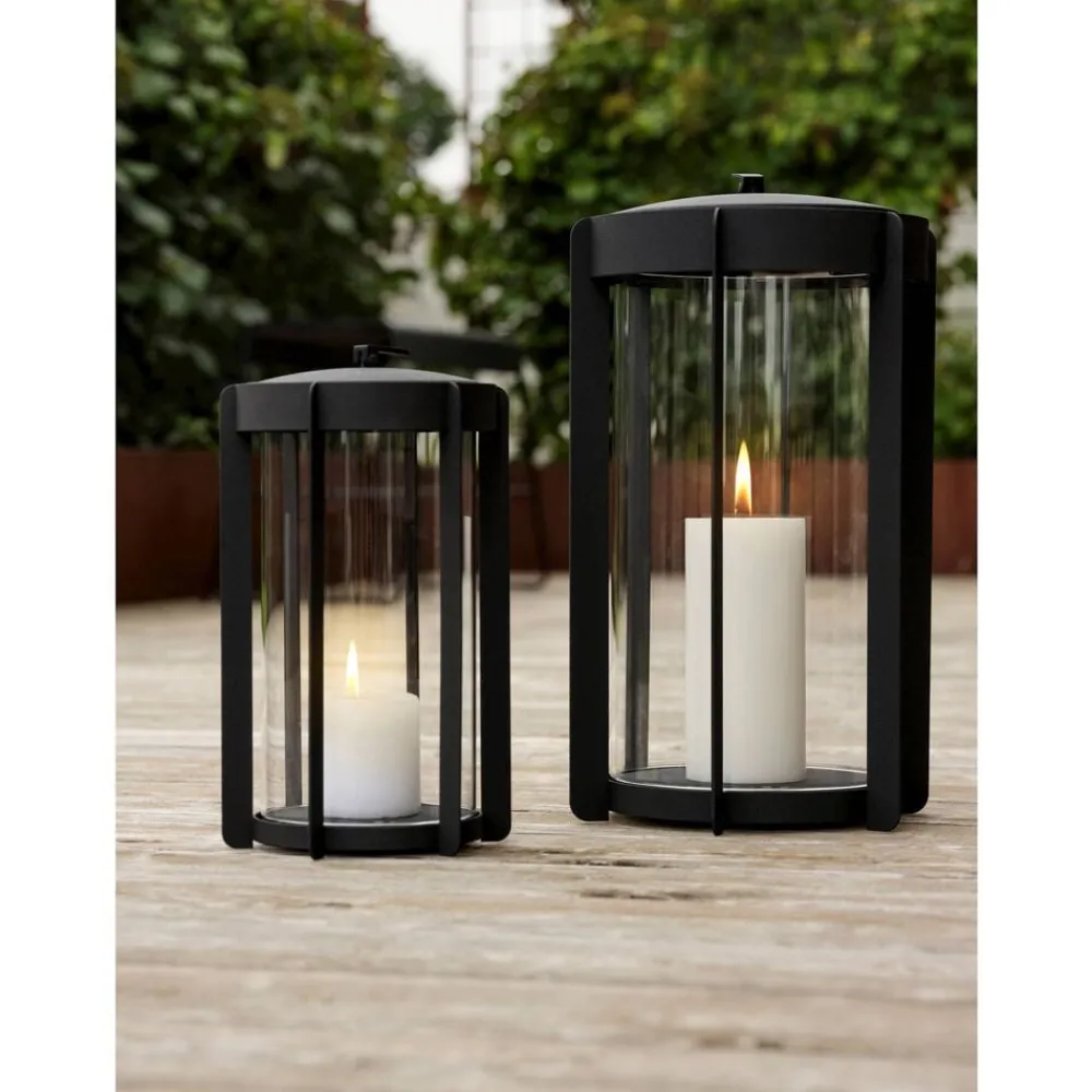 Firefly-lanternerne med glassider findes i to højder, hhv. 25 og 35 cm og er udført i pulverlakeret stål. Topstykket er let at løfte af, når et nyt lys skal sættes i. Du vipper bare den lille silikonestrop op, og lægger den ned igen, når lyset er skiftet. Der er noget tidløst over udtrykket, og designinspirationen er da også hentet flere hundrede år tilbage, hvor datidens vogtere gik med lanterner gennem byerne. Her er en moderne version, der er klar til at kaste hyggelys på terrasser og altaner, når tusmørket melder sig.