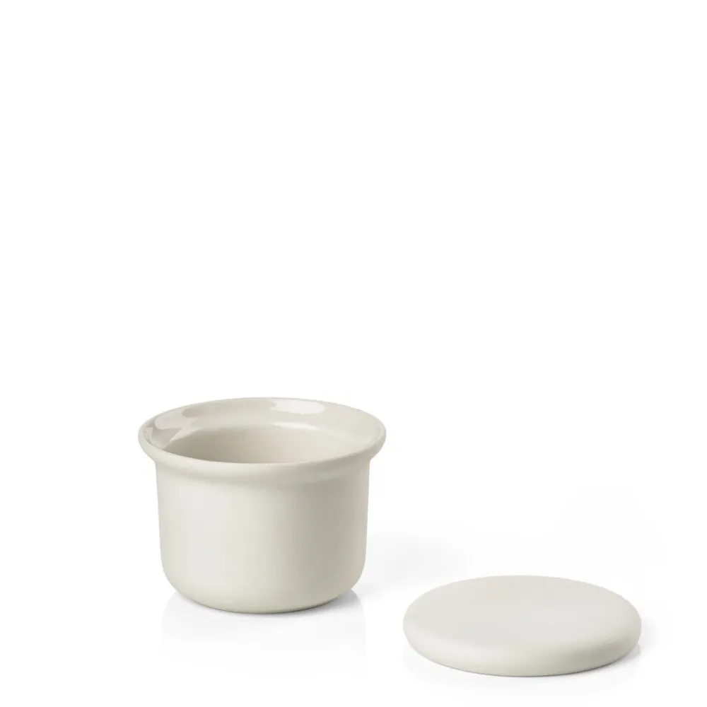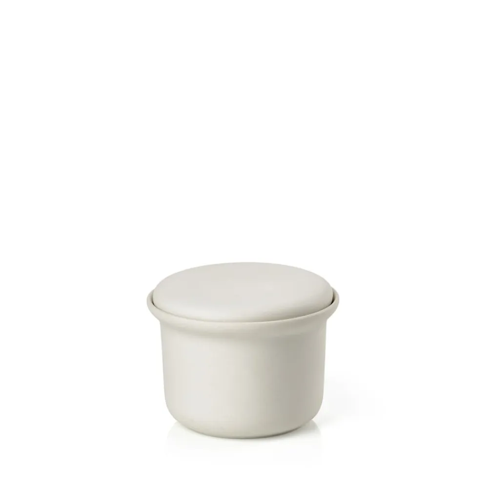 Fin keramikkrukke med låg, som kan bruges som fyrfadsstage, til smykker, hårelastikker, vatrondeller, makeup eller til lidt sunde snacks, mens hårkuren eller ansigtsmasken virker. Krukken har mat yderside og blank inderside i en skøn offwhite farve.