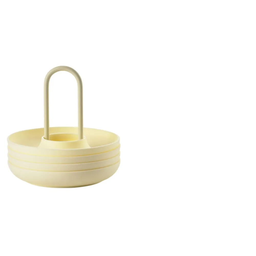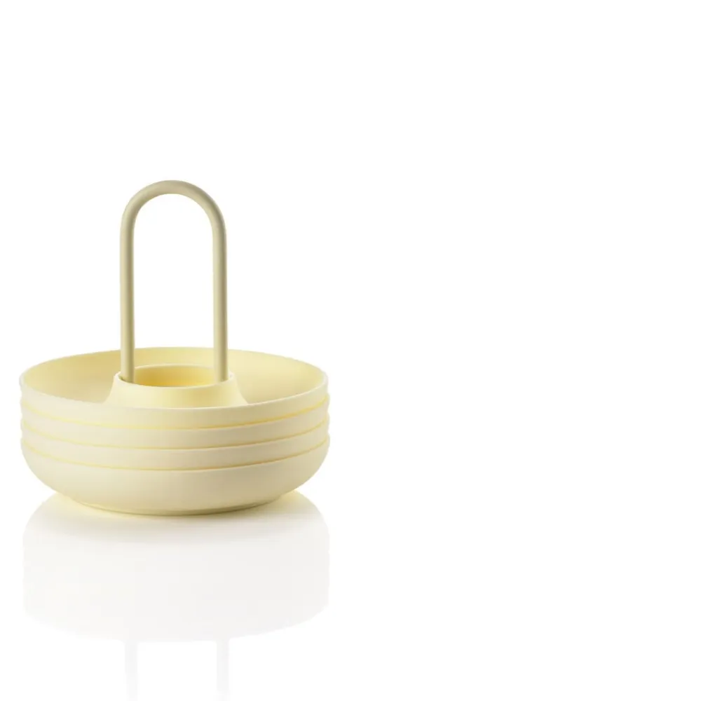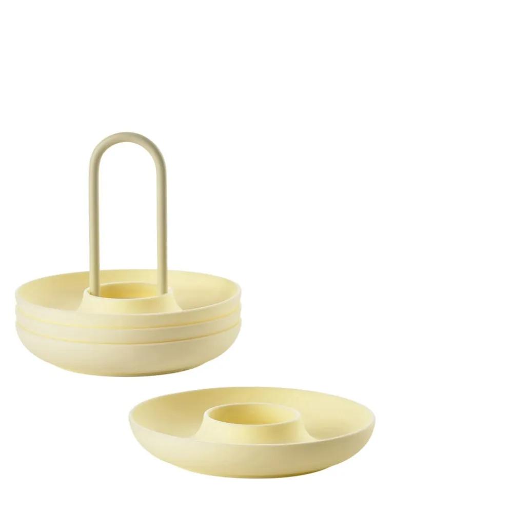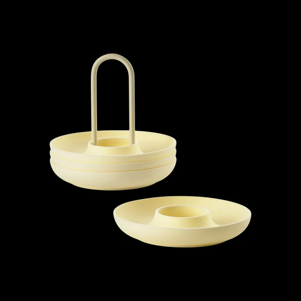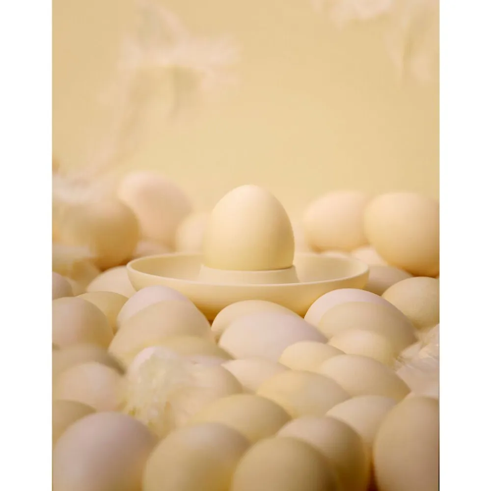 De fire æggebægre i holder fra Singles kan sættes på bordet med kun én hånd. Og den buede kant fanger både salt, æggeskaller og gæsternes opmærksomhed. Så kan du spise brunch med stil – fx i selskab med gode venner.