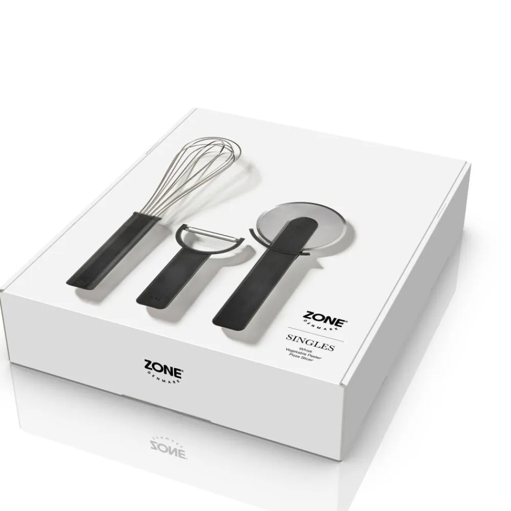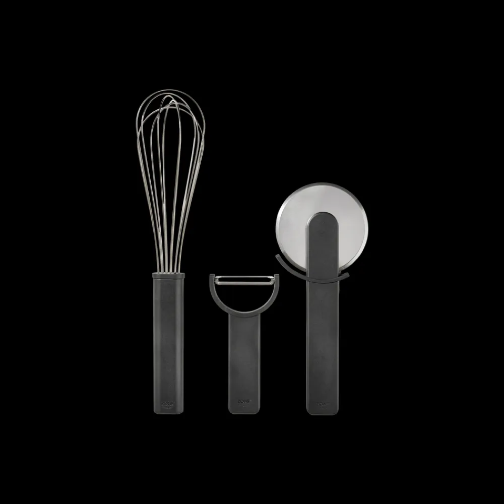 Køkkenredskabssættet består af 3 dele, piskeris, grøntsagsskræller og pizzahjul.