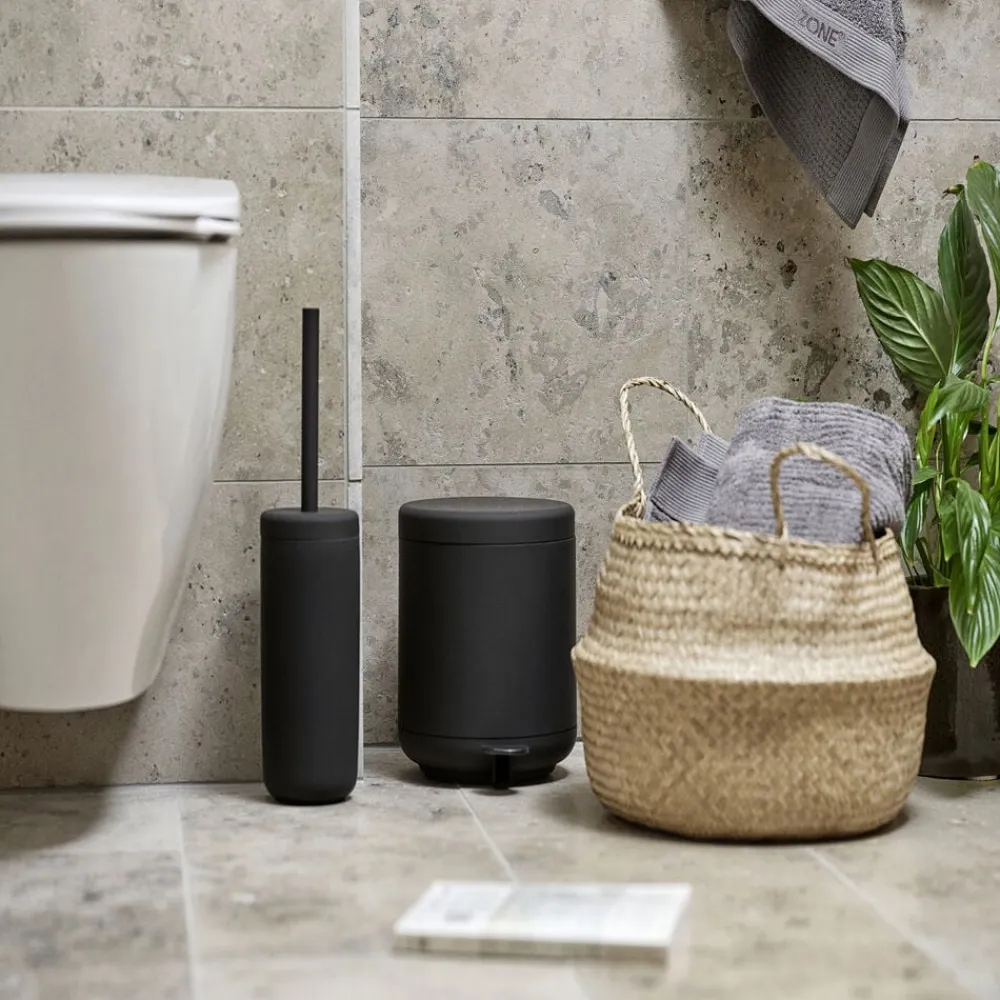 Den elegante pedalspand har samme højde som toiletbørsten, og sammen danner de et fint par på badeværelsesgulvet.