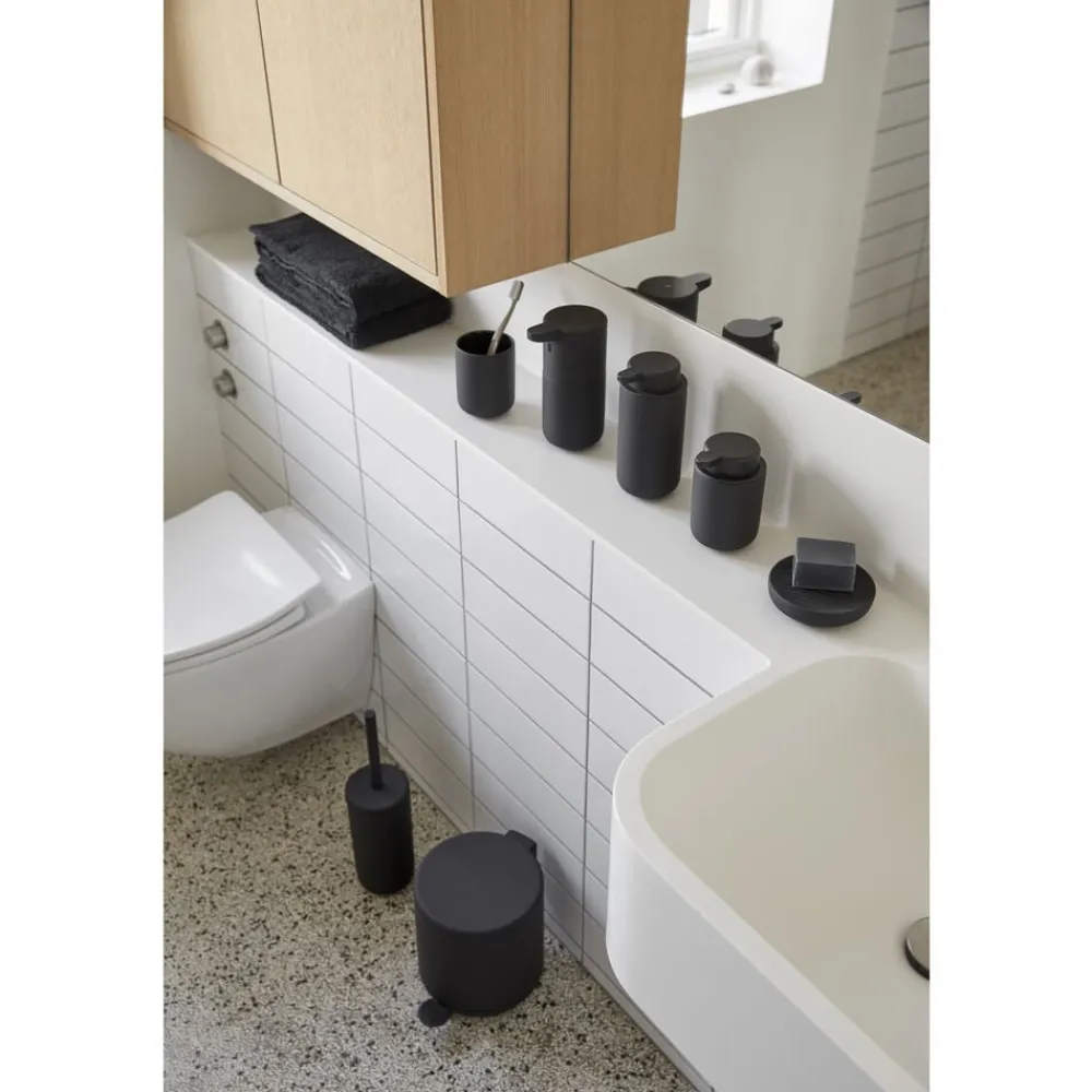 Sæbedispenseren har eksempelvis en lang tud for optimal pumpefunktion, ligesom toiletbørsten er udstyret med en praktisk inderkop, så overskydende vand let kan tømmes af – og så har børsten en god arbejdslængde og glider let på plads i holderen.