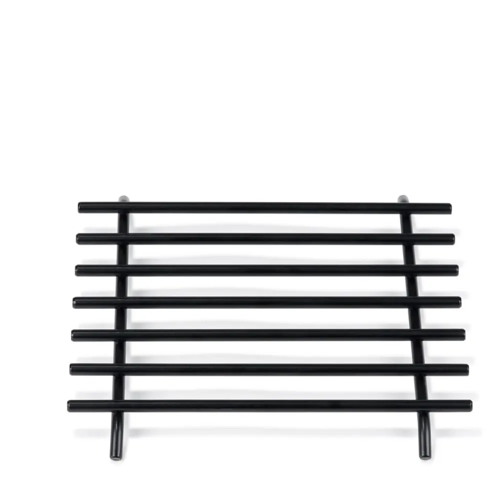 Gryderist med mat sort coating. 24 x 24 cm, 7 ribber og skridsikre fødder. Brug gryderisten som bordskåner på spisebordet, så de varme gryder og pander ikke skader bordet, eller som afsætningsrist ved siden af komfuret.