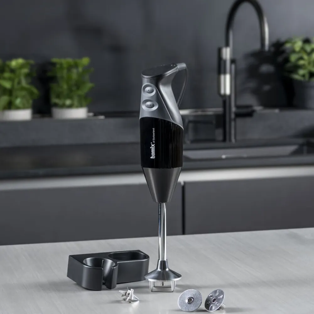 bamix® Gastro Pro-1-stavblender med en kraftig 200 watt motor, der sikrer pålidelig hjælp til selv de hårdeste opgaver i køkkenet. Stavblenderen har to hastighedsindstillinger og softgrip-sikkerhedsknap. Til produktet medfølger multifunktionskniv, blenderskive, piskeskive, vægholder samt en instruktionsmanual. Livstidsgaranti på motor.