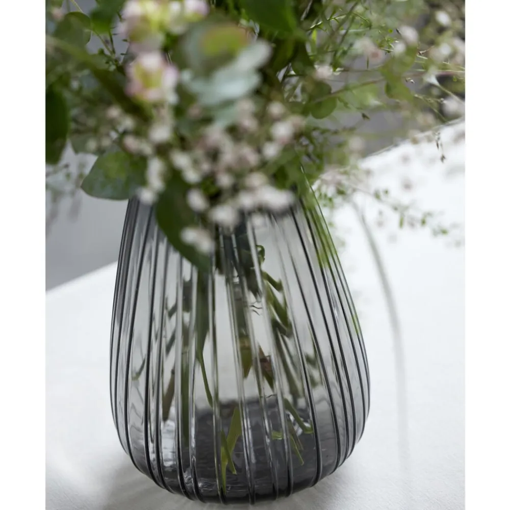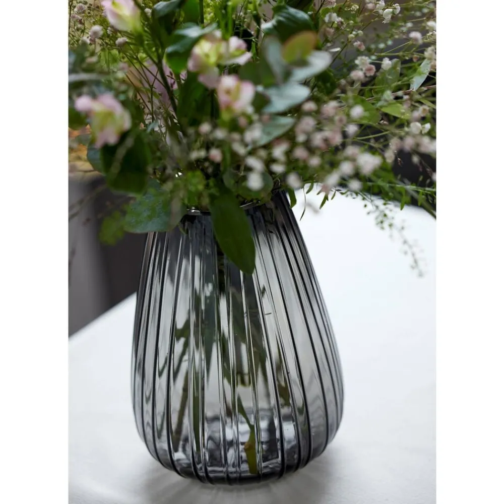 Den flotte vase i gennemfarvet glas har det samme fine, riflede look som Kusintha-seriens vandglas- og flasker. Vasen fås i grøn, amber, pink, blå og smoke. Når du køber fra Kusintha-kollektionen, støtter du samtidig udsatte børn i verdens fattigste områder. 22 cm høj.