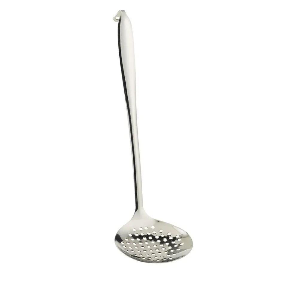 Hulske i stål som gør det let at skimme uønskede emner fra eksempelvis suppe.