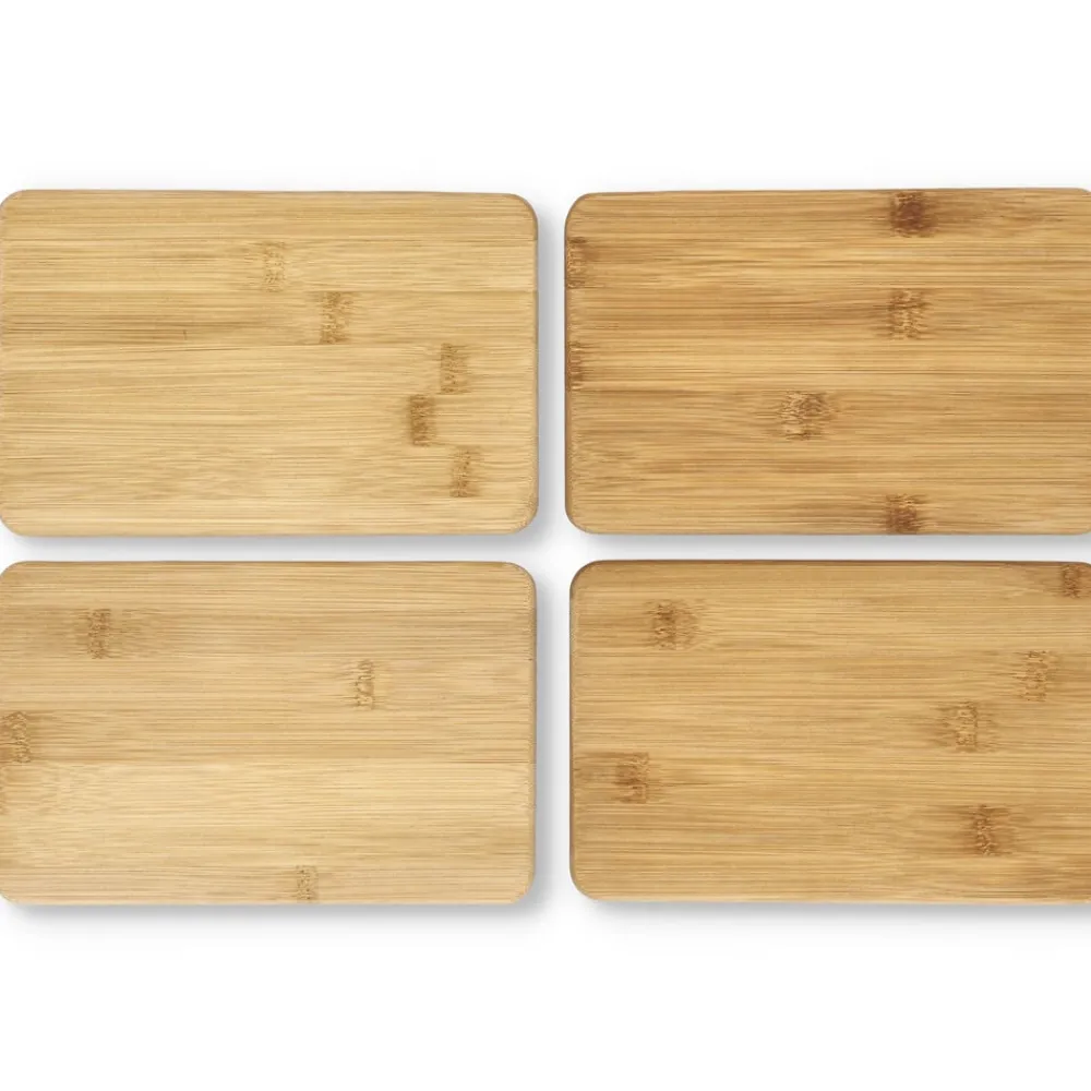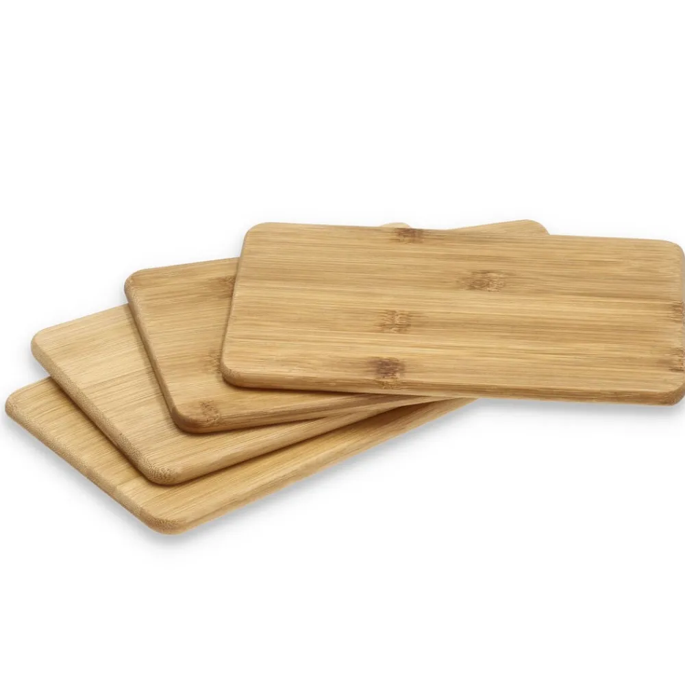 4 funktionelle smørebrætter i bambus i en praktisk størrelse på 19 x 12 cm. De er fine både som smørebrætter på morgen- eller frokostbordet og til små anretninger med ost eller tapas. Eller brug dem som flotte bordskånere på middagsbordet. Vaskes i hånden med varmt vand og sæbe.