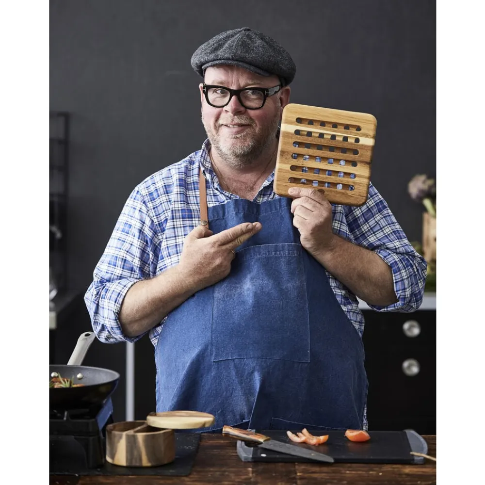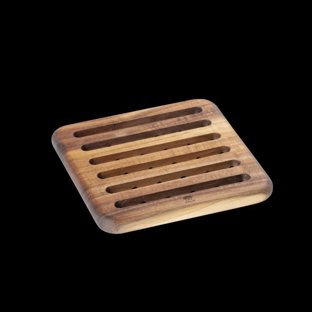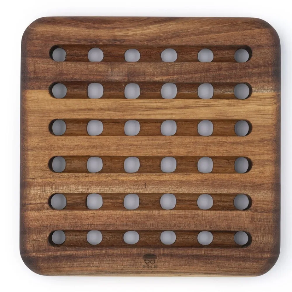Bordskåner i smukt akacietræ i en praktisk størrelse på 18 x 18 cm med flot afrundede hjørner. Designet er stilrent og funktionelt med udfræsede kanaler på begge sider, så varmen fra grydens eller fadets underside ledes væk.