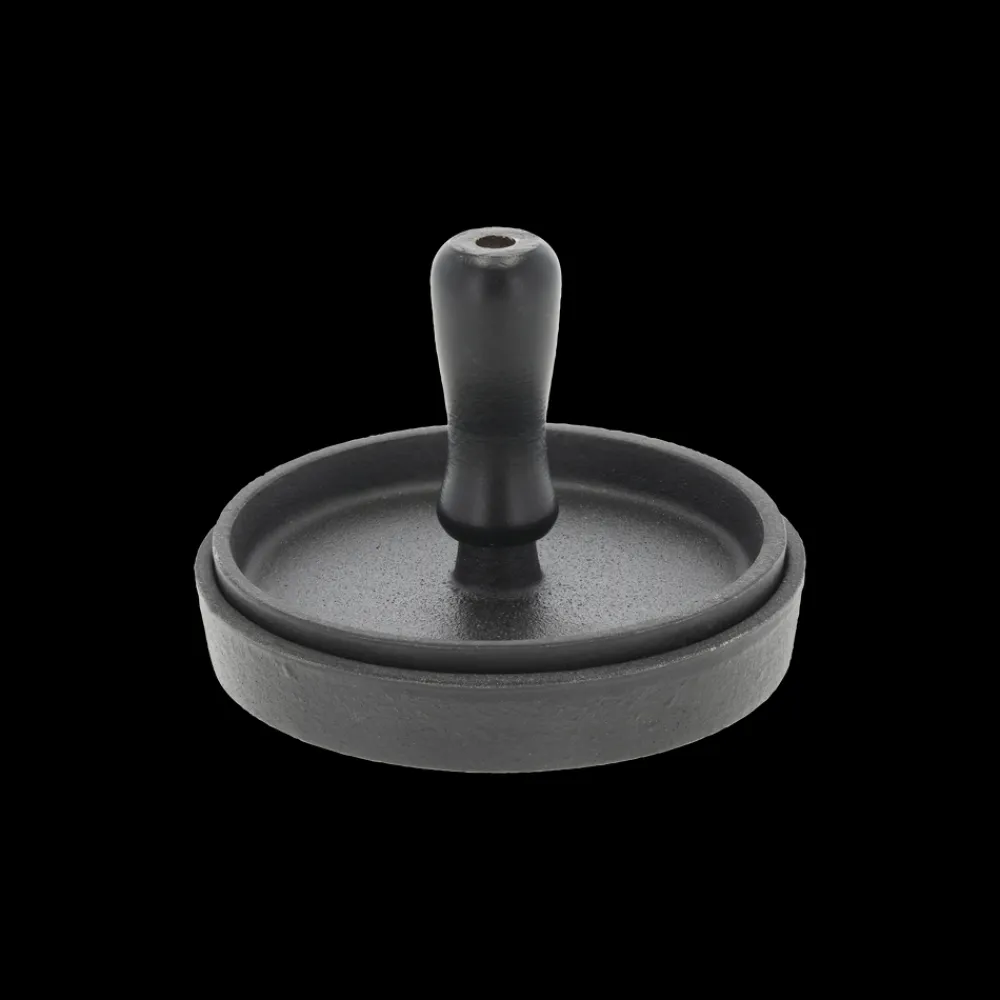 Burgerpresser fremstillet i oliebehandlet støbejern. Oliebehandlingen lægger bunden til en naturlig belægning, som giver gode stegeegenskaber, og støbejernet fastholder og fordeler varmen jævnt og effektivt. Få perfekte runde bøffer og slip samtidig for fedtede fingre. Den nederste del af burgerpresseren kan bruges til stegning af bøffen på komfur eller grill. Den øverste del med trægrebet må ikke bruges på komfur eller grill.
