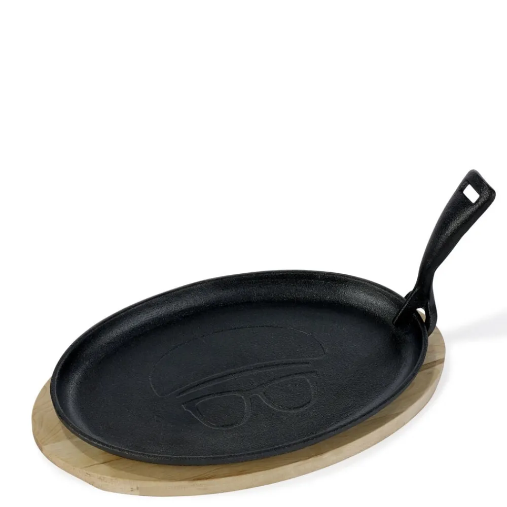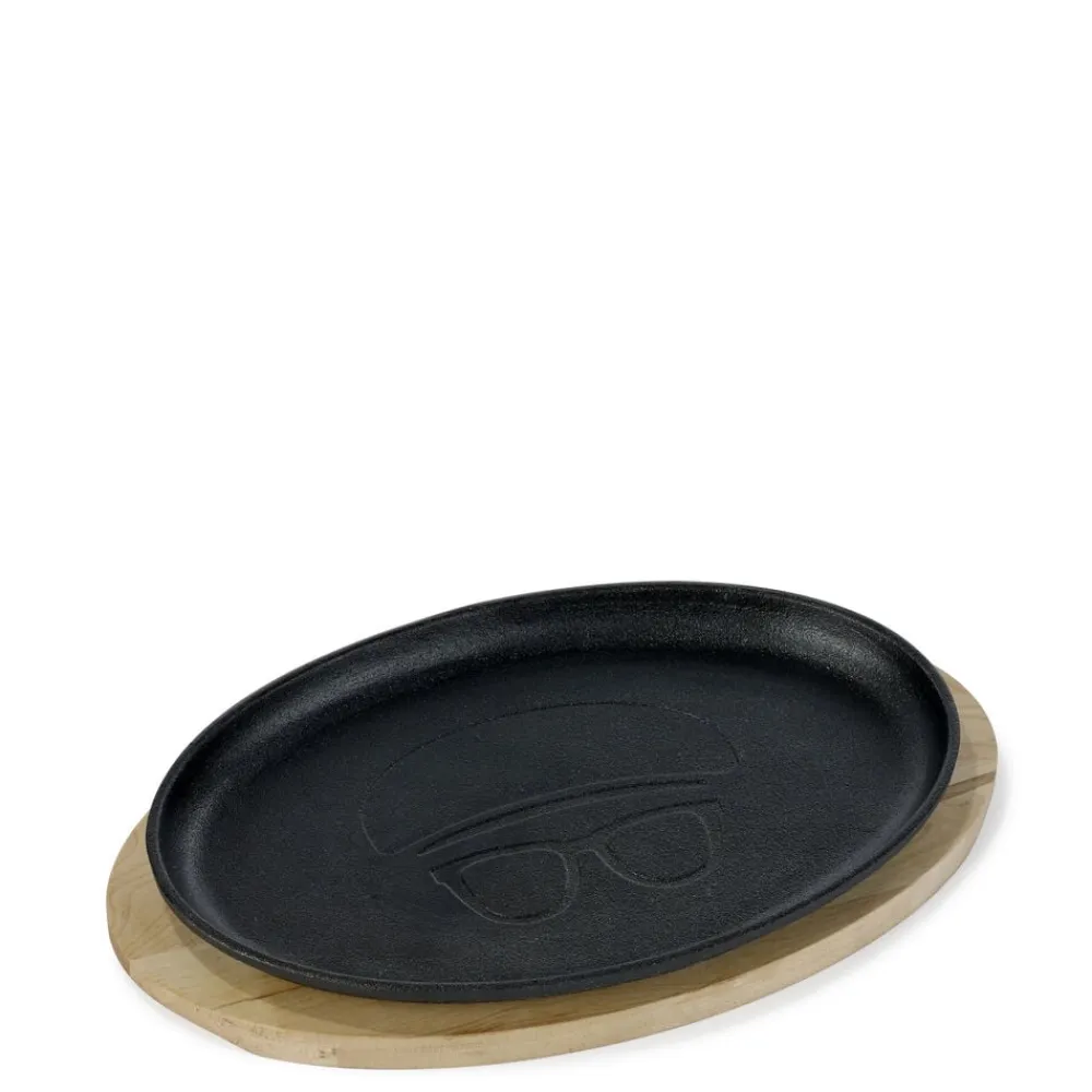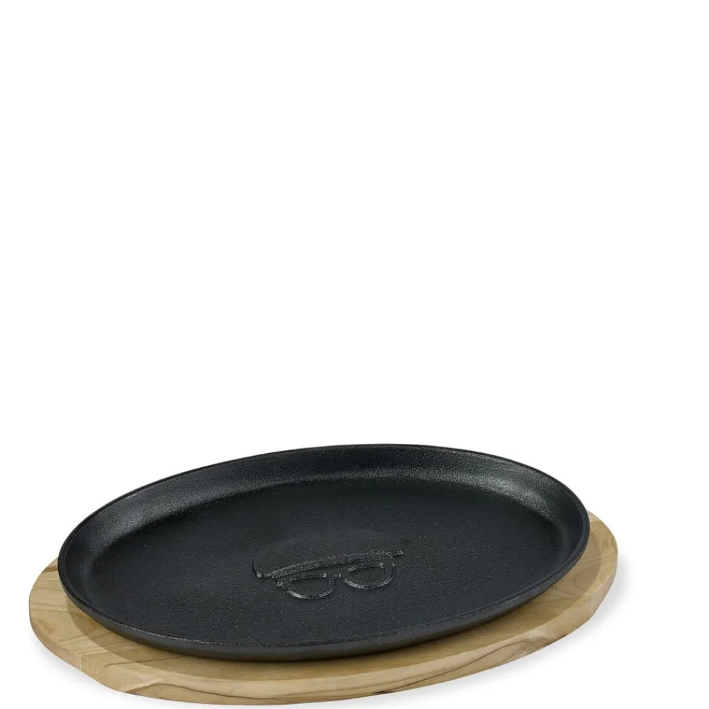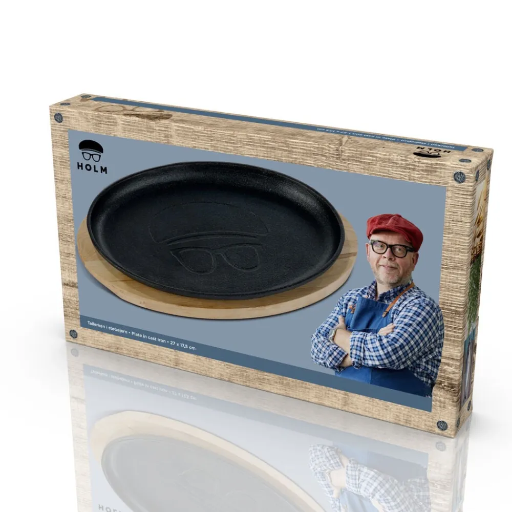 Tallerken i støbejern inkl. bordskåner i ahorn. Tallerkenen egner sig perfekt til servering men også til tilberedning i grill eller ovn.