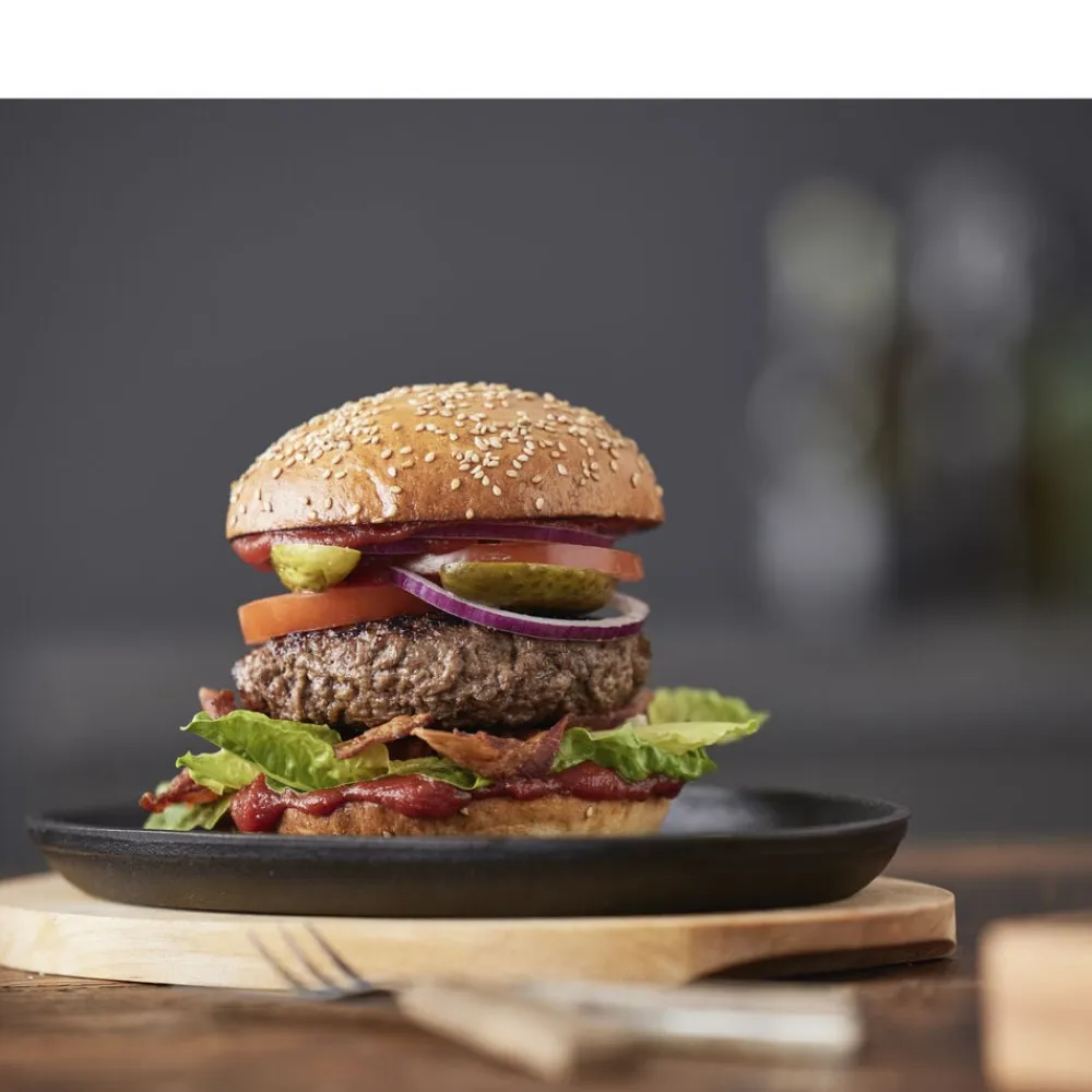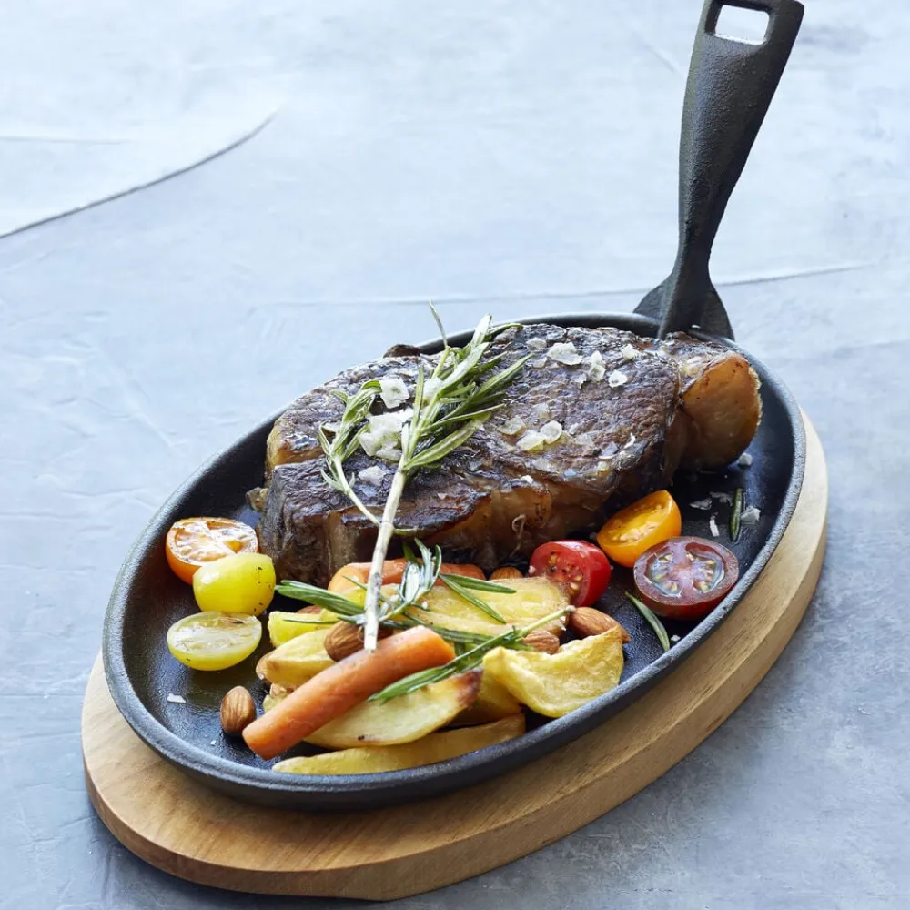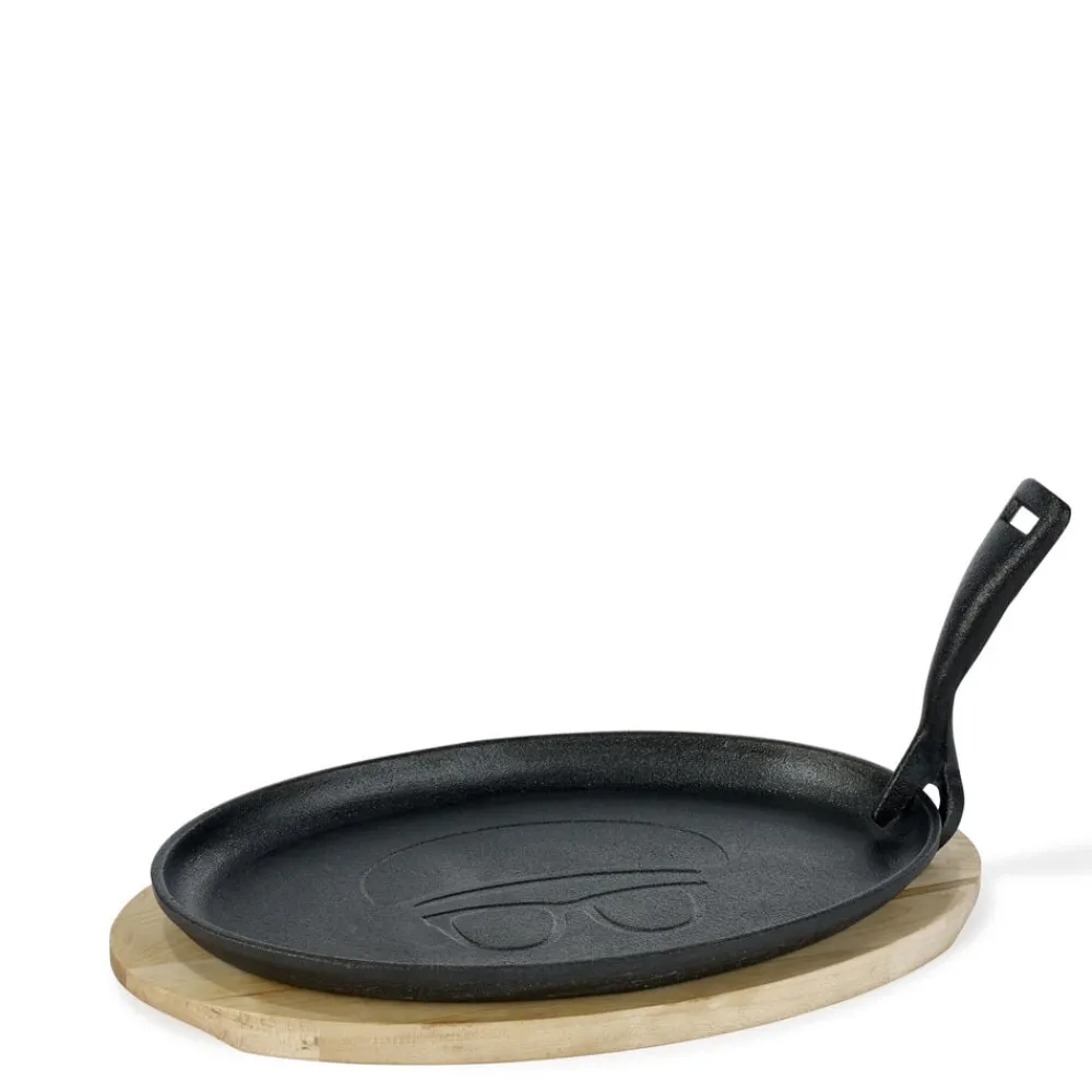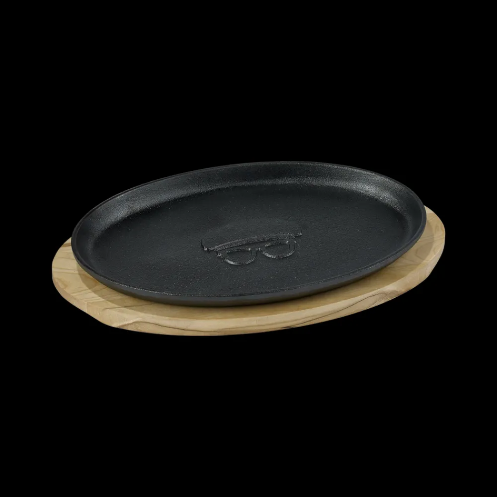 Tallerken i støbejern inkl. bordskåner i ahorn. Tallerkenen egner sig perfekt til servering men også til tilberedning i grill eller ovn.