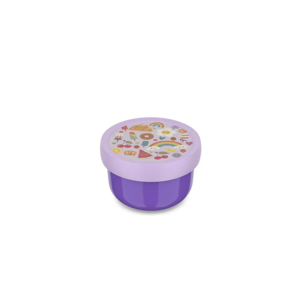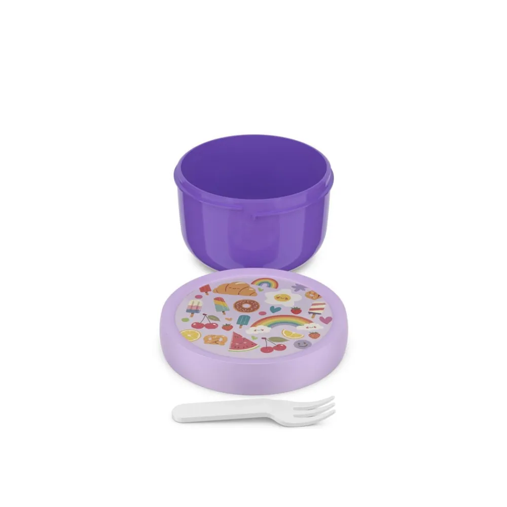 Mepals lille runde 300 ml Campus frugtboks med gaffel holder helt tæt og er nem for børnene at bruge. Boksen er ensfarvet med motiv på låget og fås med de samme motiver som de andre produkter i Mepals Campus-serie til børn. Frugtboksen kan vaskes i opvaskemaskine og kan (dog uden låg) anvendes i mikroovn. Fremstillet i Holland.