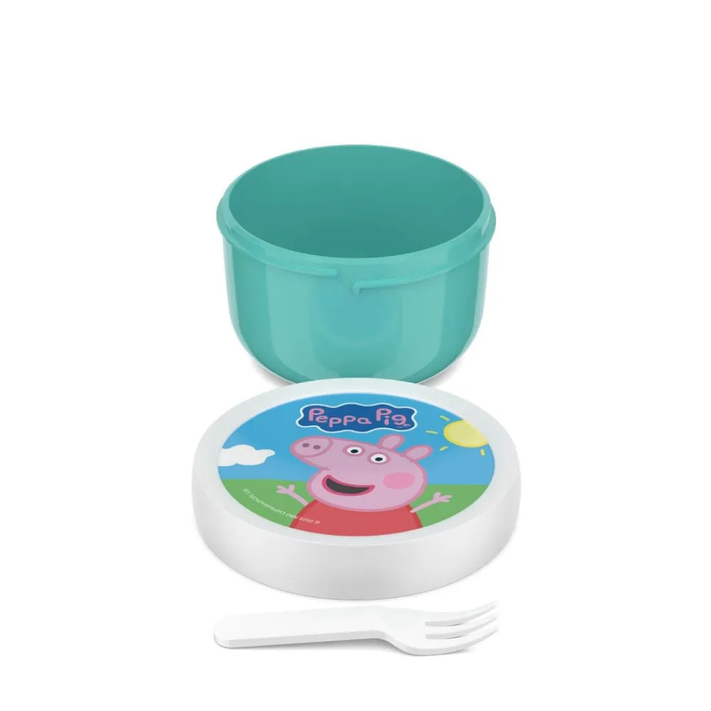 Mepals lille runde 300 ml Campus frugtboks med gaffel holder helt tæt og er nem for børnene at bruge. Boksen er ensfarvet med motiv på låget og fås med de samme motiver som de andre produkter i Mepals Campus-serie til børn. Frugtboksen kan vaskes i opvaskemaskine og kan (dog uden låg) anvendes i mikroovn. Fremstillet i Holland.