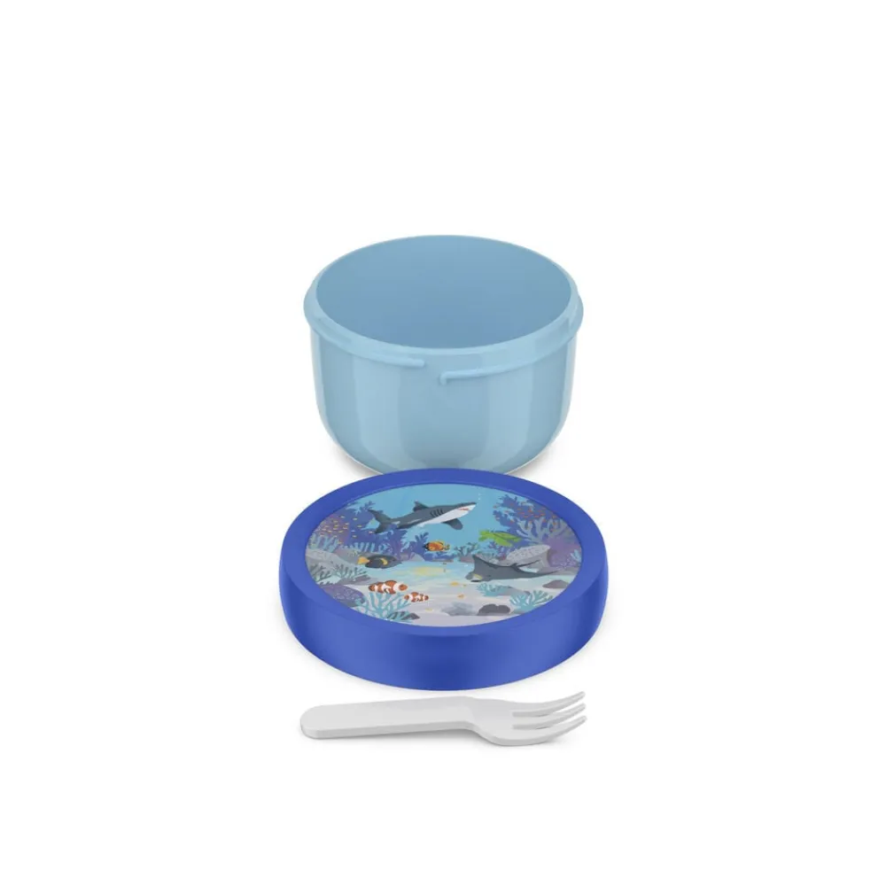 Mepals lille runde 300 ml Campus frugtboks med gaffel holder helt tæt og er nem for børnene at bruge. Boksen er ensfarvet med motiv på låget og fås med de samme motiver som de andre produkter i Mepals Campus-serie til børn. Frugtboksen kan vaskes i opvaskemaskine og kan (dog uden låg) anvendes i mikroovn. Fremstillet i Holland.