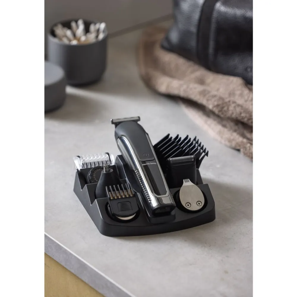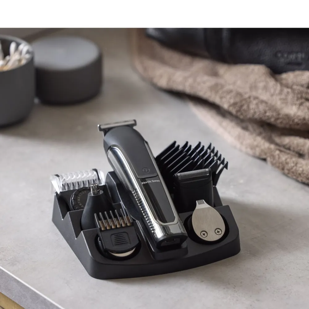Denne hårtrimmer tilbyder et bredt udvalg af funktioner til både trimning og barbering af hår og skæg. Trimmeren har et display, der viser både brugstid og batteriniveau, så du altid er opdateret på enhedens tilstand. Der medfølger forskellige påsætningskamme (12, 9, 6, og 3 mm) samt en justerbar kam, der spænder fra 1–9 mm, hvilket giver mulighed for at vælge forskellige længder og stilarter. T- og U-formede knive som sammen med en shaver-funktion, tilbyder en grundig og tæt barbering. Næsetrimmeren gør det nemt at fjerne uønskede hår i næsen. Trimmeren har en brugstid på 80 minutter på en fuld opladning, og kan nemt oplades via det medfølgende USB-kabel. Tilbehørsdele kan opbevares pænt og praktisk i den medfølgende opbevaringsstation. Nem vedligeholdelse med rengøringsbørste.