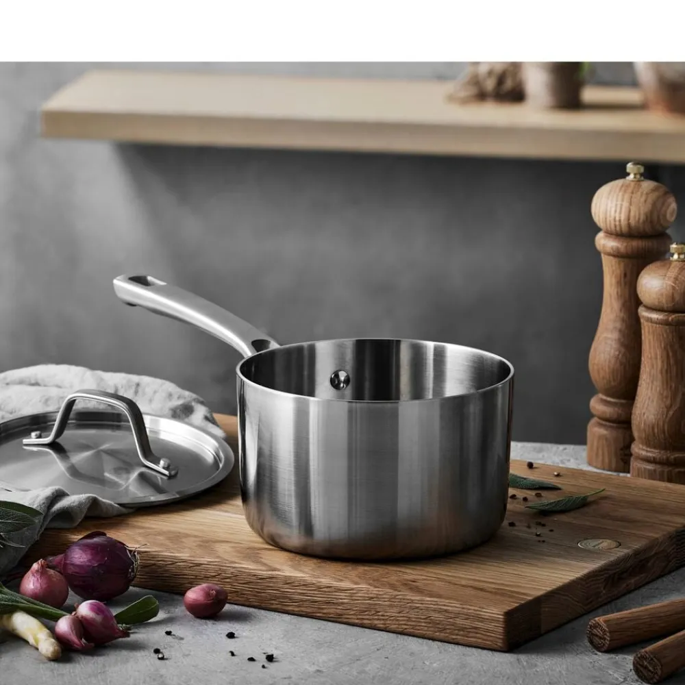 Kasserolle med låg, 1,9 liter (16 cm). Divette-serien fra Pillivuyt Gourmet er fremstillet i 3-ply rustfrit stål med en silkeblød satinfinish på ydersiden, som giver et enkelt og elegant udtryk. Konstruktionen af to lag rustfrit stål med et aluminiumlag imellem betyder, at varmen fordeles hurtigt og fastholdes jævnt. Indvendigt er seriens kasseroller forsynet med en praktisk måleskala til nem og præcis opmåling.